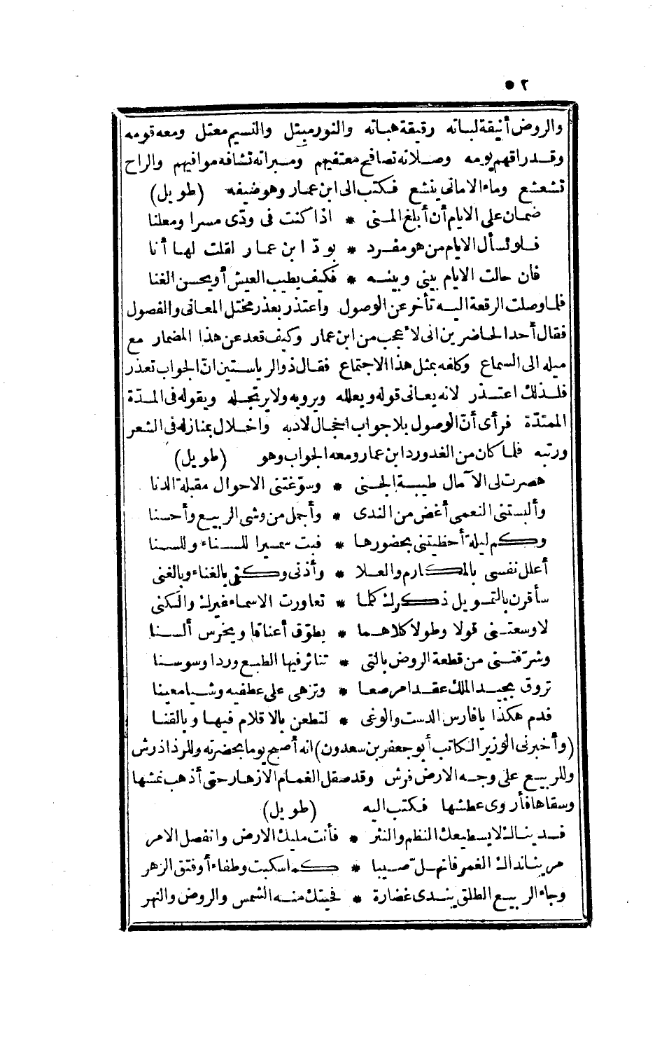 فلما وصلت الرقعة إليه تأخر عن الوصول، واعتذر بعذر مختل المعاني والفصول، فقال أحد الحاضرين أني لا عجب من ابن عمار، وكيف قعد عن هذا المضمار، مع ميله إلى السماع، وكلفه بمثل هذا الاجتماع، فقال ذو الرياستين أن الجواب تعذر، فلذلك اعتذر، لأنه يعاني قوله ويعلله، ويرويه ولا يرتجله، ويقوله في المدة، الممتدة، فرأى أن الوصول بلا جواب إخجال لأدبه، وإخلال بمنازله في الشعر ورتبه، فلما كان من الغد ورد ابن عمار ومعه الجواب وهو: طويل