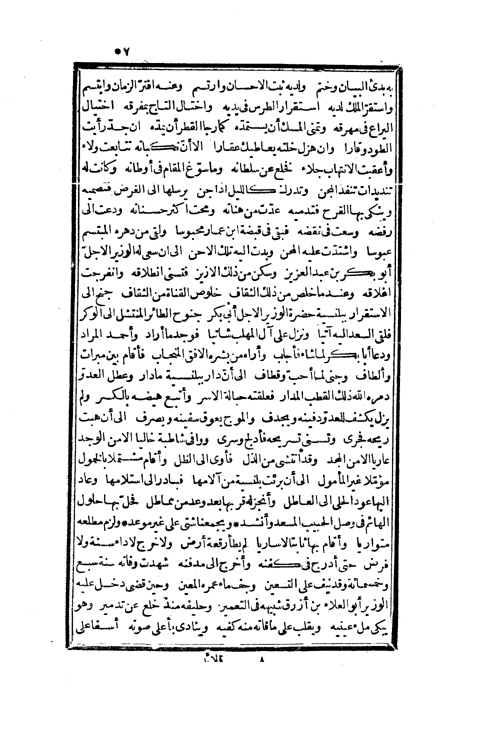 به بدئ البيان وختم، ولديه ثبت الإحسان وارتسم، وعنه افتر الزمان وابتسم، واستقر الملك لديه، استقرار الطرس في يديه، واختال التاج بمفرقه، اختيال اليراع في مهرقه، وتمنى المسك أن يستمده، كما رجا القطر أن يمده، إن جد رأيت الطود وقارا، وأن هزل خلته يعاطيك عقارا، إلا ان نكباته تتابعت ولاء، وأعقبت الانتهاب جلاء، فخلع عن سلطانه وما سوغ المقام في أوطانه، وكانت له تنديدات تنفذ المجن، وتدرك كالليل إذا جن، يرسلها إلى الغرض فتصميه، وينكابها القرح فتدميه، عدت من هناته، ومحت أكثر حسناته، ودعت إلى رفضه، وسعت في نقضه، فبقي في قبضة ابن عمار محبوساً، ولقي من دهره المبتسم عبوساً، واشتدت عليه المحن، وبدت إليه تلك الأحن، إلى أن سعى له الوزير الأجل أبو بكر بن عبد العزيز، وسكن من ذلك الأزيز، فتسنى انطلاقه، وانفرجت أغلاقه، وعندما خلص من ذلك الثقاف، خلوص القناة من الثقاف، جنح إلى الاستقرار ببلنسية حضرة الوزير الأجل ابي بكر، جنوح الطائر المنتشل إلى الوكر، فلقي السعد إليه آتياً، ونزل على آل المهلب شاتياً، فوجد ما أراد، واحمد المراد، ودعا أبا بكر لما شاء فأجاب، وأراه زمن بشره الأفق المنجاب، فأقام بين مبرات والطاف، وجنى لما أحب وقطاف، إلى أن دار ببلنسية ما دار، وعطل العدو دمره الله ذلك القطب المدار، فعلقته حبالة الأسر، واتبع هيضه بالكسر، ولم يزل يكشف للعدو دفينه ويجدف، والموج يعوق سفينه ويصرف، إلى ظأن هبت ريحطه فجرى، وتسنّى تسريحه فأدلج وسرى، ووافى شاطبة خالياً إلا من الوجد، عارياً غلا من المجد، وقد انتشى من الذل، فأوى إلى الظل، وأقام مشتملاً بالخمول، موملاً غير المأمول، إلى أن برئت بلنسية من آلامها، فبادر إلى استلامها، وعاد إليها عود الحلي إلى العاطل، وأنجز له قربها بعد وعد من مماطل، فحل بها حلول الهائم في وصل الحبيب المسعد، وأنشد، ويجمعنا شتى على غير موعد، ولزم مطلعه متوارياً، وأقام بها ثابتاً لا سارياً، لم يطا رقعة أرض، ولا خرج لأداء سنة ولا فرض، حتى أدرج في كفنه، وأخرج إلى مدفنه، شهدت وفاته سنة سبع وخمسمائة وقد نيف على التسعين، وجف ماء المعين، وحين قضى دخل عليه الوزير أبو العلاء ابن ازرق شبيهه في التعمير، وحليفه منذ خلع عن تدمير، وهو يبكي ملء عينيه، ويقلب على مافاته.