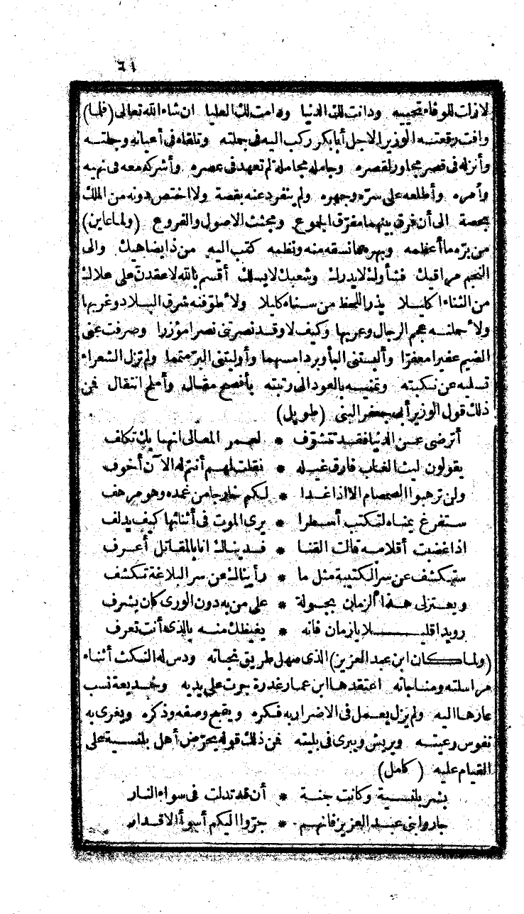 إن شاء الله تعالى، فلما وافت رقعته الوزير الأجل أبا بكر ركب إليه في جملته، وتلقاه في أعيانه وجلته، وأنزل في قصر مجاور لقصره، وجامله مجاملة لم تعهد في عصره، وأشركه معه في نهيه وأمره، وأطلعه على سره وجهره، لم ينفرد عنه بقصة، ولا اختص دونه من الملك بحصة، إلى أن فرق بينهما مفرق الجموع، ومجثث الأصول والفروع، ولما عاين من بره ما أعظمه، وبهره ما نسقه منه ونظمه، كتب إليه، من ذا يضاهيك، وإلى النجم مراقيك، فشاوك لا يدرك، وشعبك لا يسلك، اقسم لأعقدن على علاك من الثناء إكليلا، يذر اللحظ من سناه كليلا، ولأطوفنه شرق البلاد وغربها، ولا حملنه عجم الرجال وعربها، وكيف لا وقد نصرتني نصرا مؤزرا، وصرفت عني الضيم عفيرا معفرا، وألبستني البأو بردا مسنما، وأوليتني البر متمما، ولم تزل الشعراء تسليه عن نكبته، وتمنيه بالعودة إلى رتبته، بأفصح مقال: وأملح انتقال: فمن ذلك قول الوزير أبي جعفر البني، طويل