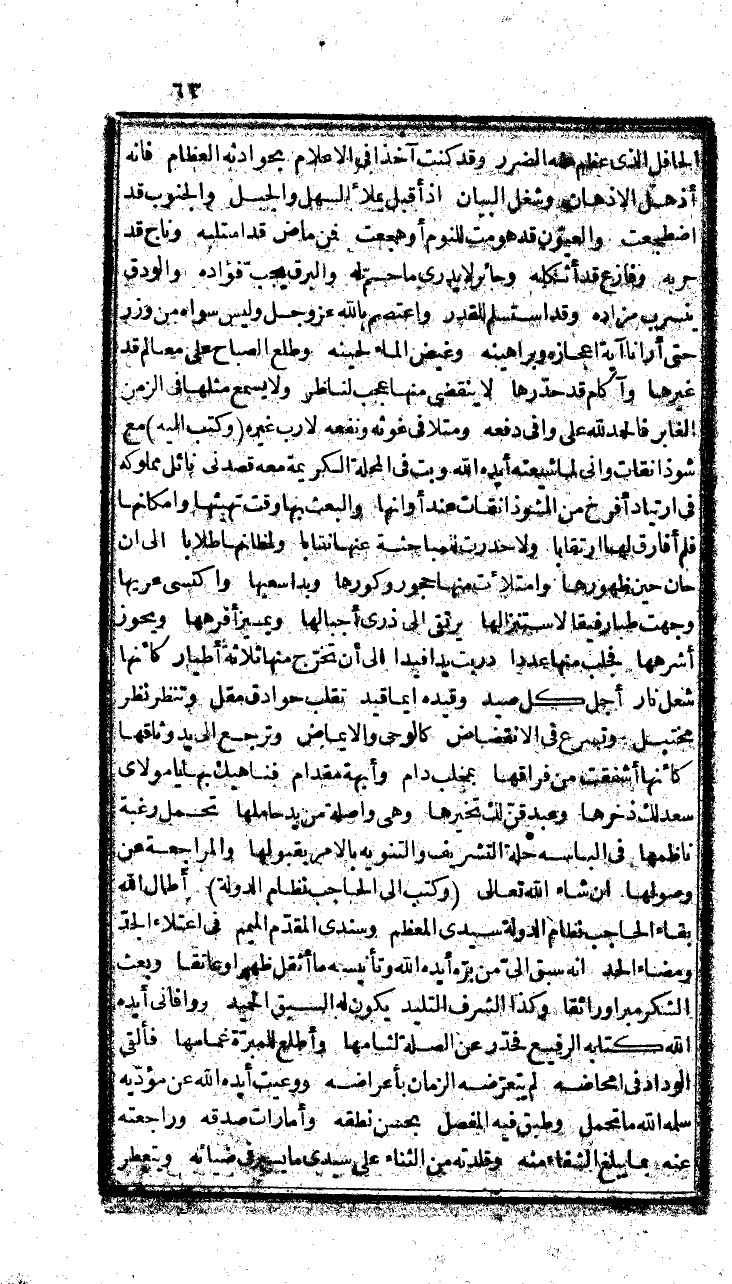 من السيل الحافل الذي عظم منه الضرر وقد كنت آخذا في الإعلام، بحوادثه العظام، فإنه أذهل الأذهان، وشغل البيان، إذا أقبل يملأ السهل والجبل، والجنوب كما اضطجعت، والعيون قد هومت للنوم أو هجعت، فمن ماض قد استلبه، وناج قد حربه، وفازع قد أثكله، وحائر لا يدري ما حم له، والبرق يجب فواده، والودق ينسرب مزاده، وقد استسلم للقدر، واعتصم بالله عز وجل من وزر، حتى أرانا غاية إعجازه وبراهينه، وغيض الماء لحينه، وطلع الصباح على معالم قد غيرها، وأكام قد حدرها، لا ينقضي منها عجب لناظر، ولا يسمع مثلها في الزمن الغابر، فالحمد لله على وافي دفعه، ومتلافي غوثه ونفعه، لا رب غيره، وكتب إليه مع شوذانقات وأني لما شيعته أيده الله وبت في المحلة الكريمة معه قصدني نائل مملوكه في ارتياد أفرخ من الشوذانقات عند أوانها، والبعثة بها وقت تهيئها وإمكانها، فلم أفارق لها ارتقابا، ولا حدرت للمباحثة عنها نقابا، ولمظانها طلابا، إلى أن حان حين ظهورها، وامتلأت منها جحور وكورها، وبدا سعيها، واكتسى عريها، وجهت طبا رفيقا لاستنزالها، يرتقي إلى ذرى أجبالها، ويميز أفرهها، ويحوز أشرهها، فجلب منها عددا، دربت يدا فيدا، إلى أن تخرج منها ثلثه أطيار، كأنها شعل نار، أجل كل صيد، وقيده أيما قيد، تقلب حوادق مقل، وتنظر نظر مختبل، وتسرع في الانقضاض، كالوحي والإيماض، وترجع إلى يد وثاقها، كأنها أشفقت من فراقها، بمخلب دام، وأبهة مقدام، فناهيك بها يا مولاي سعد لك ذخرها، وعبد قن لك تخيرها، وهي واصلة من يد حاملها، تحمل رغبة ناظمها، في إلباسها حلة التشريف والتنويه بالأمر بقبولها، والمراجعة عن وصولها، إن شاء الله تعالى، وكتب إلى الحاجب نظام الدولة، أطال الله بقاء الحاجب نظام الدولة سيدي المعظم، وسندي المقدم المتيم، في اعتلا الجد، ومضاء الحد، أنه سبق إلي من بره أيده الله وتانسيه ما أثقل ظهرا وعاتقا، وبعث الشكر مبراً ورائقا، وكذا الشرف التليد، يكون له السبق الحميد، ووافاني أيده الله كتابه الرفيع فحدر عن الصلة لثامها، واطلع للمبرة غمامها، فألفى الوداد في أمحاضه لم يتعرضه الزمان بأعراضه، ووعيت أيده الله عن مؤيده سلمه الله ما تحمل، وطبق فيه المفصل، بحسن