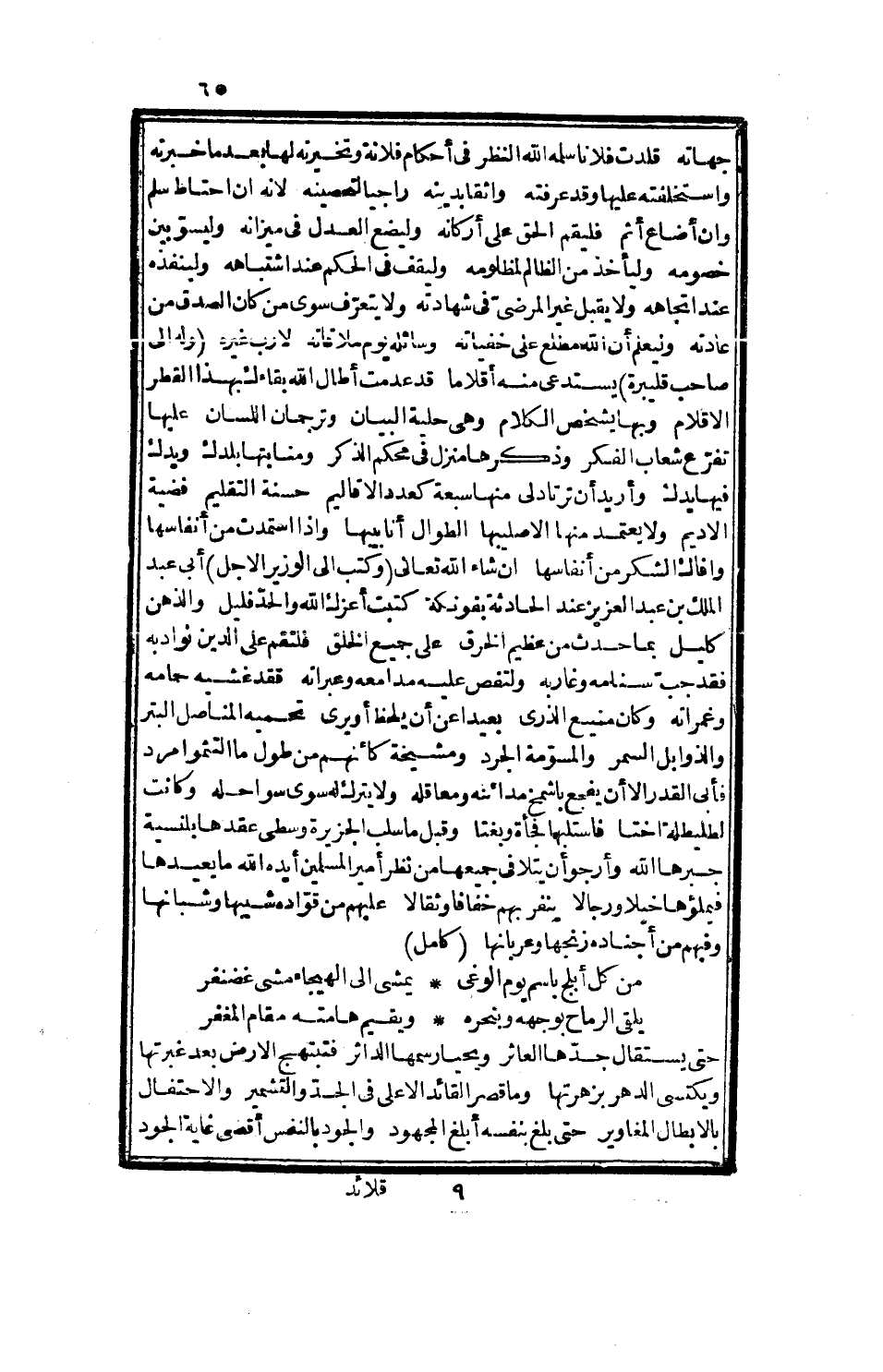 فلما رآني أمسك، وسبح كأنه قد تنسك، وله صك بتقديم إلي الأحكام في إحدى جهاته، قلدت فلانا سلمه الله النظر في أحكام فلانة وتحزينه، لها بعد ما خبرته، واستحلفته عليها وقد عرفته، واثقا بدينه، راجيا لتحصينه، لأنه أن احتاط سلم، وأن أضاع إثم، فليقم الحق على أركانه، وليضع العدل في ميزانه، وليسوا بين خصومه، وليأخذ من الظالم لمظلومه، وليقف في الحكم عند اشتباهه، ولينفذه عند اتجاهه، ولا يقبل غير المرضي في شهادته، ولا يعرف سوى الاستقامة من عادته، وليعلم أن الله مطلع على خفياته، وسائله يوم ملاقاته، لا رب غيره، وله إلى صاحب قليبرة يستدعي منه أقلاما، قد عدمت أطال الله بقاءك بهذا القطر الأقلام، وبها يشخص الكلام، وهي حلية البيان، وترجمان اللسان، عليها تفرع شعاب الفكر، وذكرها منزل في محكم الذكر، ومنابتها بلدك، ويدك فيها يدك، وأريد أن ترداد لي منها سبعة كعدد الأقاليم، حسنة التقليم، فضية الأديم، ولا يعتمد منها إلا صليبها، الطوال أنابيبها، وإذا استمدت من أنفاسها، وافاك الشكر من أنفاسها، إن شاء الله تعالى، وكتب إلى الوزير الأجل أبي عبد الملك بن عبد العزيز عند الحادثة بفونكة، كتبت أعزك الله والحد فليل، والذهن كليل، بما حدث من عظيم الخرق، على جميع الخلق، فلتقم على الدين نوادبه، فقد جب سنامه وغاربه، ولتفض عليه مدامعه وعبراته، فقد غشيه حمامه وغمراته، وكان منيع الذرى، بعيداً عن أن يلحظ أو يرى، تحميه المناصل البتر، والذوابل السمر، والمسومة الجرد، ومشيخة كأنهم من طول ما التثموا مرد، فأبى القدر إلا أن يفجع بأشمخ مآذنه ومعاقله، ولا يترك له سوى سواحله، وكانت لطليطلة أختا، فاستلبها فجأة وبغتا، وقبل ما سلب الجزيرة وسطى عقدها بلنسية جيرها الله وأرجو أن يتلافى جميعها من نظر أمير المسلمين أيده الله ما يعيدها فيملاها خيلا ورجالا.