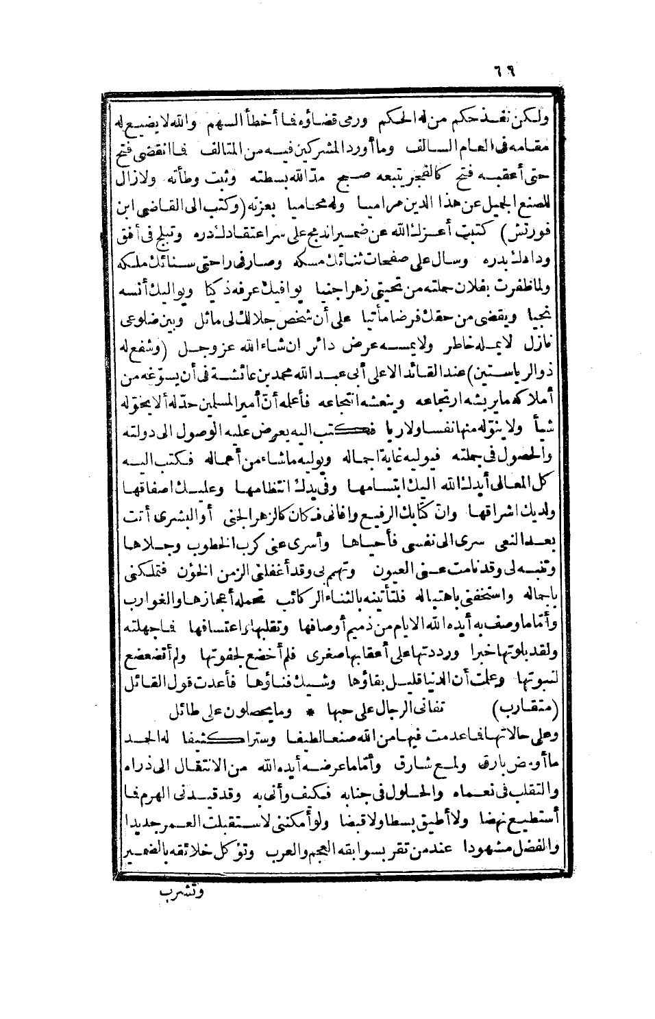 حتى يستقال جدها العاثر، ويحيا رسمها الدائر، فتبتهج الأرض بعد غبرتها، ويكتسي الدهر بزهرتها، وما قصر القائد الأعلى في الجد والتشمير، والاحتفال بالإبطال المغاوير، حتى بلغ بنفسه المجهود، والجود بالنفس أقصى غاية الجود، ولكن نفذ حكم من له الحكم، ورمى قضاءه فما أخطأ السهم، والله لا يضيع له مقامه في العالم السالف، وما أورد المشركين فيه من المتالف، فما انقضى فتح حتى أعقبه فتح، كالفجر يتبعه صبح، مد الله بسطته، وثبت وطأته، ولازال للصنع الجميل عن هذا الدين مراميا، وله محاميا، بعزته وكتب إلى القاضي ابن فورتش، كتب أعزك الله عن ضمير اندمج على سر اعتقادك دره، وتبلج في مرافق ودادك بدره، وسال على صفحات ثنائك مسكه، وصار في راحتي سنائك ملكه، ولما ظفرت بفلان حملته من تحيتي زهرا جنيا، يوافيك عرفه ذكيا، ويواليك أنسه نجيا، ويقضي من حقك فرضا ماتيا، على أن شخص جلالك لي ماثل، وبين ضلوعي نازل، لا يمله خاطر، ولا يمسه عرض دائر، إن شاء الله عز وجل، وشفع له ذو الرياستين عند القائد الأعلى أبي محمد بن عائشة في أن يسوغه من أملاكه ما يرشيه ارتجاعه، ونعشه انتجاعه، فأعلمه أن أمير المسلمين حد له ألا يخوله شيئان ولا ينوله منها نفسا ولا ريا، فكتب إليه يعرض عليه الوصول إلى دولته، والحصول في جملته، فيوليه غاية أجماله، ويوليه ما شاء من أعماله، فكتب إليه، كل المعالي أيدك الله إليك ابتسامها، وفي يدك انتظامها، وعليك أصفاقها، ولديك إشراقها، وإن كتابك الرفيع وافاني فكان كالزهر الجني، أو البشري أتت بعد النعي، سرى إلى نفسي فأحياها، وأسرى عني كرب الخطوب وجلاها، وتنبه لي وقد نامت عني العيون، وتهتم بي وقد أغفلني الزمن الخؤن، فتملكني بإجماله، واستخفني باهتباله، فلتأتينه بالثناء الركائب، تحمله أعجازها والغوارب، وأما ما وصف به أيده الله الأيام من ذميم أوصافها، وتقلبها واعتسافها، فما جهلته ولقد بلوتها خبراً، ورددتها على أعقابها صغرى، فلم أخضع لجفونها، ولم أتضعضع لنبوتها، وعلمت أن الدنيا قليل بقاؤها، وشيك فناؤها، فاعدت قول القائل: متقارب