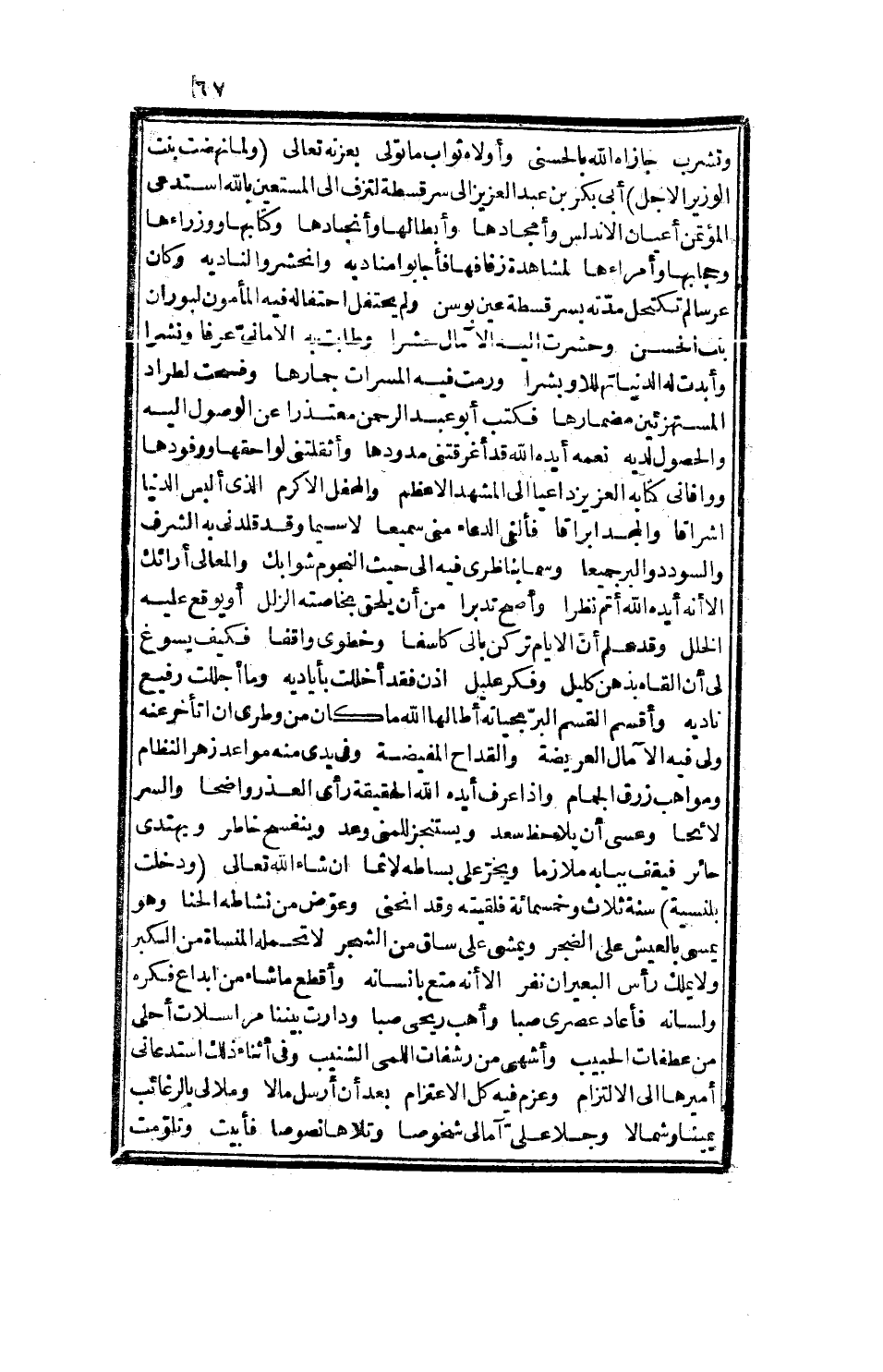 في نعماه، والحلول في جنابه، فكيف وأنى به، وقد قيدني الهرم فما أستطيع نهضا، ولا أطيق بسطا ولا قبضا، ولو أمكنني لاستقبلت العمر جديدا، والفضل مشهودا، عند من تقر بسوابقه العجم والعرب، وتوكل خلائقه بالضمير وتشرب، جازاه الله بالحسنى، وأولاه ثواب ما تولى، بعزته تعالى، ولما نهضت بنت الوزير الأجل أبي بكر بن عبد العزيز إلى سرقسطة لتزف إلى المستعين بالله استدعى المؤتمن أعيان الأندلس وأمجادها، وأبطالها وأنجادها، وكتابها ووزراءها، وحجابها وأمرائها، لمشاهدة زفافها فأجابوا مناديه، وانحشروا لناديه، وكان عرسا لم تكتحل مدته بسرقسطة عين بوسن، ولم يحتفل احتفاله فيه المأمون لبوران بنت الحسن، وحشرت إليه الآمال حشرا، وطابت به الأماني عرفا ونشرا، وأبدت له الدنيا تهللا وبشرا، ورمت فيه المسرات جمارها، وفسحت لطراد المستهزئين مضمارها، فكتب أبو عبد الرحمن معتذرا عن الوصول إليه، والحصول لديه، نعمه أيده الله قد أغرقتني مدودها، وأثقلتني لواحقها ووفودها، ووافني كتابه العزيز داعيا إلى المشهد الأعظم، والمحفل الأكرم، الذي ألبس الدنيا إشراقا، والمجد إبراقا، فألفى الدعاء مني سميعا، لاسيما وقد قلدتني به الشرف والسؤدد والبر جميعا، وسما بناظري فيه إلى حيث النجوم شوابك، والمعالي أرائك، إلا أنه أيده الله أتم نظرا، وأصح تدبرا، من أن يلحق بخاصته الزلل، أو يوقع عليه الخلل، وقد علم أن الأيام تركن بالي كاسفا، وخطوي واقفا، فكيف يسوغ إلي أن ألقاه بذهن كليل، وفكر عليل، إذن فقد أخللت بأياديه، وما أجللت رفيع ناديه، وأقسم القسم البر بحياته أطالها الله ما كان من وطري أن أتأخر عنه ولي فيه الآمال العريضة، والقداح المفيضة، وفي يدي منه مواعد زهر النظام، ومواهب رزق الجمام، وإذا عرف أيده الله الحقيقة رأى العذر واضحا، والسر لائحا، وعسى أن يلاحظ سعد، ويستنجز للمنى وعد، وينفسح خاطر، ويهتدي حار، فيقف ببابه ملازما، ويخر على بساطه لائما، إن شاء الله تعالى ودخلت بلنسية سنة ثلاث وخمسمائة فلقيته وقد انحنى، وعوض من نشاطه الحنا، وهو يمسي بالعيش على الضجر، ويمشي على ساق من الشجر، لا تحمله المنساة من الكبر، ولا يملك رأس البعير أن نفر، إلا أنه امتنع بإنسانه، واقطع ما شاء من إبداع فكره ولسانه، فأعاد عصري صبا، واهب ريحي صبا، ودارت بيننا مراسلات أحلى من عطفات الحبيب، وأشهى من رشفات