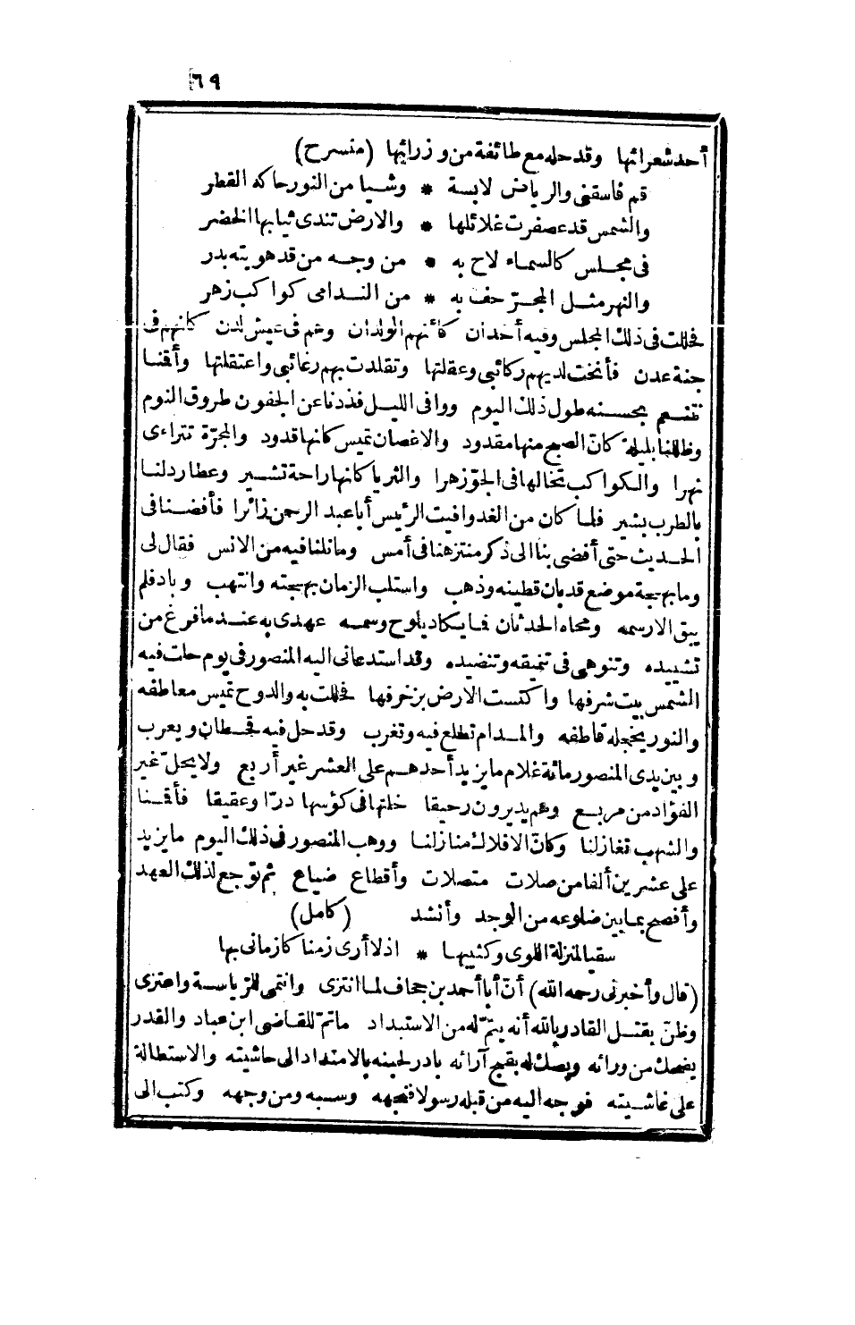 فحللت في ذلك المجلس وفي أخدان، كأنهم الولدان، وهو في عيش لدن، كأنهم في جنة عدن، فانحنت لديهم ركائبي وعقلتها، وتقلدت بهم رغائبي واعتقلتها، وأقمنا نتنعم بحسنه طول ذلك اليوم، ووافى الليل فذدنا عن الجفون طروق النوم، وظللنا بليلة كان الصبح منها مقدود، والأغصان تميس كأنها قدود، والمجرة تتراءى نهرا، والكواكب تخالها في الجو زهرا، والثريا كأنها راحة تشير، وعطارد لنا بالطرب بشير، فلما كان من الغد وافيت الرئيس أبا عبد الرحمن زائرا فأفضنا في الحديث حتى أفضى بنا إلى ذكر منتزهنا في أمس، وما نلنا فيه من الأنس، فقال لي وما بهجة موضع قد بان قطينه وذهب، واستلب الزمان بهجته وانتهب، وباد فلم يبق إلا رسمه، ومحاه الحدثان فما يكاد يلوح وسمه، عهدي به عندما فرغ من تشييده، وتنوهي في تنميقه وتنضيده، وقد استدعاني إليه المنصور في يوم حلت فيه الشمس بيت شرفها، واكتست الأرض بزخرفها، فحللت به والدوح تميس معاطفه، والنور يخجله قاطفه، والمدام تطلع فيه وتغرب، وقد حل فيه قحطان ويعرب، وبين يدي المنصور ماية غلام أحدهم على العشر غير أربع، ولا يحل غير الفؤاد من مربع، وهم يريدون رحيقا، خلتها في كؤوسها درا وعقيقا، فأقمنا والشهب تغازلنا، وكان الأفلاك منازلنا، ووهب المنصور في ذلك اليوم ما يزيد على عشرين ألفا من صلات، متصلات، وأقطاع، ضياع، ثم توجع لذلك العهد، وأفصح بما بين ضلوعه من الوجد، وأنشد، كامل