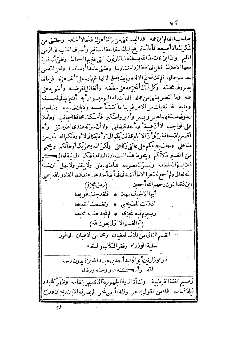 وظن بقتل القادر أنه يتم له من الاستبداد، ما تم للقاضي ابن عباد، والقدر يضحك من ورائه، ويصك له بقبح آرائه، بادر لحينه بالامتداد إلى حاشيته، والاستطالة على غاشيته، فوجه إليه من قبله رسولا فنجهه، وسبه ومن وجهه، وكتب إلى صاحب المظالم ابن عمه، قد ألبستني من برك أعزك الله ما لا أخلعه، وحملتني من شكرك ما لا أضيعه، فأنا أستريح إليك استراحة المستنيم، واصرف الذنب إلى الزمن المليم، وأن ابن عمك مد الله بسطته لما ثار ثورته التي بلغ بها السماك، وظن أنه قد بذ معها الأفلاك، نظر إلي متخازراً متشاوساً، وظنني حاسداً أو منافساً، ولعن الله من حسده جمالها، فلم تك تصلح إلا له ولم يك يصلح إلا لها، ثم تورم علي أنف عزته، فرماني بصروف محنته، وكل ذلك أتجرعه على مضضه، وأتغافل لغرضه، وأطويه على بلله، وما انتصر بشيء من عمله، إلى أن رام اليوم بسوء رايه، أن يزيد في تعسفه وبغيه، فاستقبلت من الأمر غريبا ما كنت أحسبه، ولا بان لي سببه، ولما جاءه رسولي مستفهما عبس وبسر، وأدبر واستكبر، فأمسكت محافظا للجانب، وعاملا على الواجب، لا أن هيبة أبي محمد قبضتني، ولا أن مبرته عندي اعترضتني، وأنا أقسم بالله حلقة بر لو أن الأيام قذفت بكم إلي وأنا بمكاني لأوردتكم العذب من مناهلي، وحملت جميعكم على عاتقي وكاهلي، ولكن الله يعمر بكم أوطانكم، ويحمي من الغير مكانكم، ويحوط هذه السيادة الطالعة فيكم، البانية لمعاليكم، فلا يسرك مقطعه، وليسوك مصرعه، فما مثله يمطل، ولا ينظر ولا يهمل، أن شاء الله تعالى، ولم أسمع له شعرا إلا ما أنشدني في أبي أحمد هذا عند قتله القادر بالله يحمي بن ذي النون، رمل مجزوء