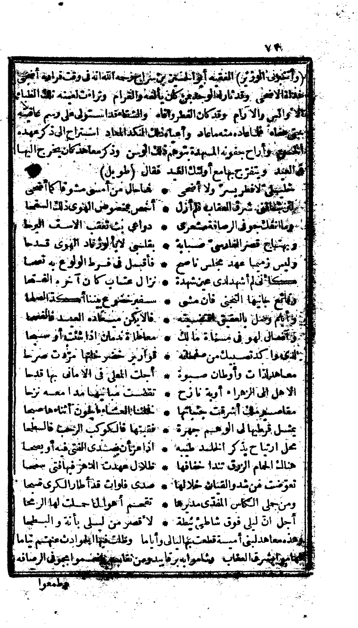 وأخبرني الوزير الفقيه أبو الحسين ابن سراج رحمه الله أنه في وقت فراره أضحى، غداة الأضحى، وقد ثار له الوجد بمن كان يألفه والغرام، وتراءت لعينه تلك الظباء الأوانس والأرام، وقد كان الفطر وافاه، والشقاء قد استولى على رسم عافيته حتى عفاه، فلما عاده منه ما عاد، وأعياه ذلك النكد المعاد، استراح إلى ذكر عهده الحسن، وأراح جفونه المسهدة بتوهم ذلك الوسن، وذكر معاهد كان يخرج إليها في العيد، ويتفرج بها مع أولئك الغيد، فقال: طويل