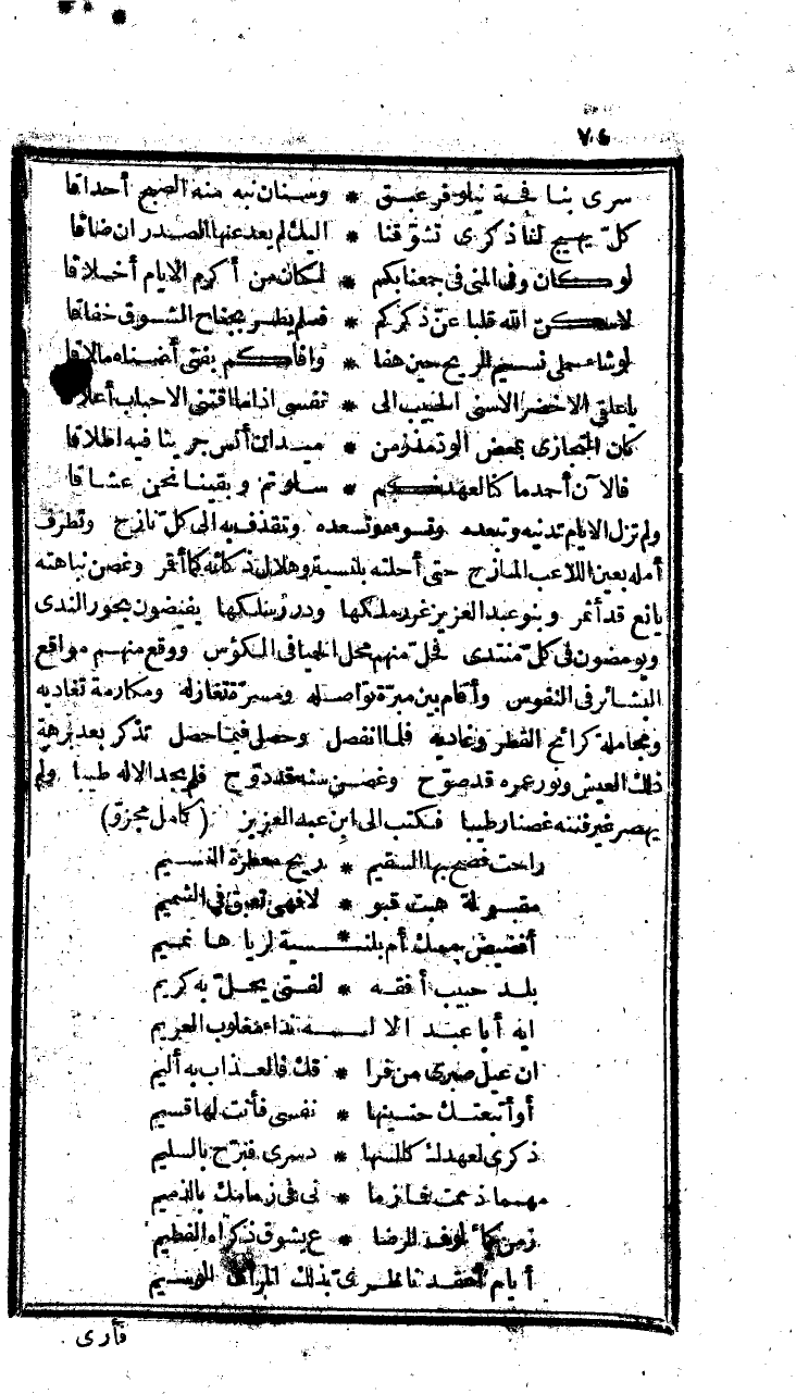 ولم تزل الأيام تدنيه وتبعده، وتسؤه وتسعده، وتقذف به إلى كل نازح، وتطرف أمله بعين اللاعب المازح، حتى أحلته بلنسية وهلال ذكائه كما أقمر، وغصن نباهته يانع قد أثمر، وبنو عبد العزيز غرر ملكها، ودرر سلكها، يفيضون بحور الندى، ويومضون في كل منتدى، فحل منهم محل الحميا في الكؤوس، ووقع منهم مواقع البشائر في النفوس، وأقام بين مبرة تواصله، ومسرة تغازله، ومجاملة كرائح القطر وغاديه، فلما انفصل، وحصل فيما حصل، تذكر بعد برهة ذلك العيش ونور عمره قد صوح وغصن سنه قد دوح، فلم يجد إلا له طيبا، ولم يهصر غير فننه غصنا رطيبا، فكتب إلى ابن عبد العزيز، كامل مجزوء