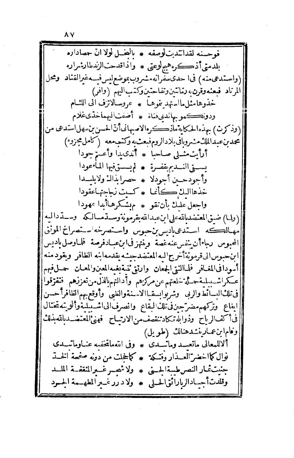 وذكرت بهذه الحكاية ما ذكره الأصبهاني أن الحسن بن سهل استدعى من محمد بن عبد الملك مشروبا في بلاد الروم فبعث به وكتب معه: كامل مجزوء