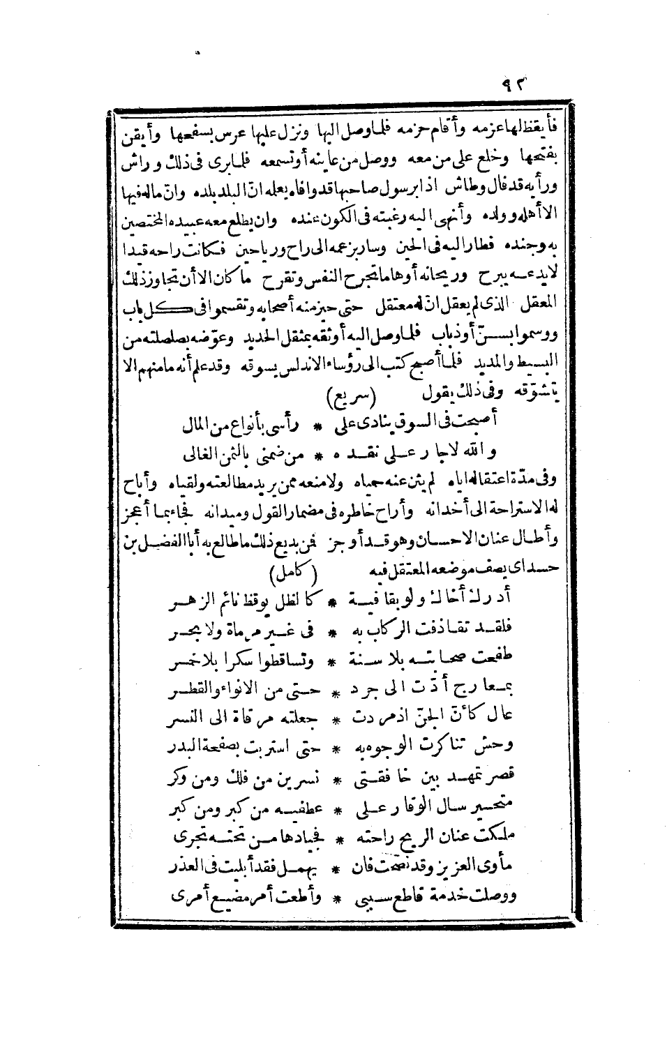 تسمعه، فلما برا في ذلك وراش، ورأيه قد فال وطاش، إذا برسول صاحبها قد وافاه يعلمه أن البلد بلده، وأن ماله فيها إلا أهله ولده، وأنهى إليه رغبته في الكون عنده، وأن يطلع معه عبيدة المختصين به وجنده، فطار إليه في الحين، وسار بزعمه إلى راح ورياحين، فكانت راحه قيداً لا يدعه يبرح، وريحانه أوهاماً تجرح النفس وتقرح، ما كان إلا أن تجاوزوا ذلك المعقل، الذي لم يعقل أن له معتقل، حتى حيز منه أصحابه وتقسموا في كل باب، ووسموا بسن أو ذباب، فلما وصل إليه أوثقه بمثقل الحديد، وعوضه بصلصلته من البسيط والمديد، فلما أصبح كتب إلى رؤساء الأندلس يسوه، وقد علم أن ما منهم إلا يتشوقه وفي ذلك يقول: سريع