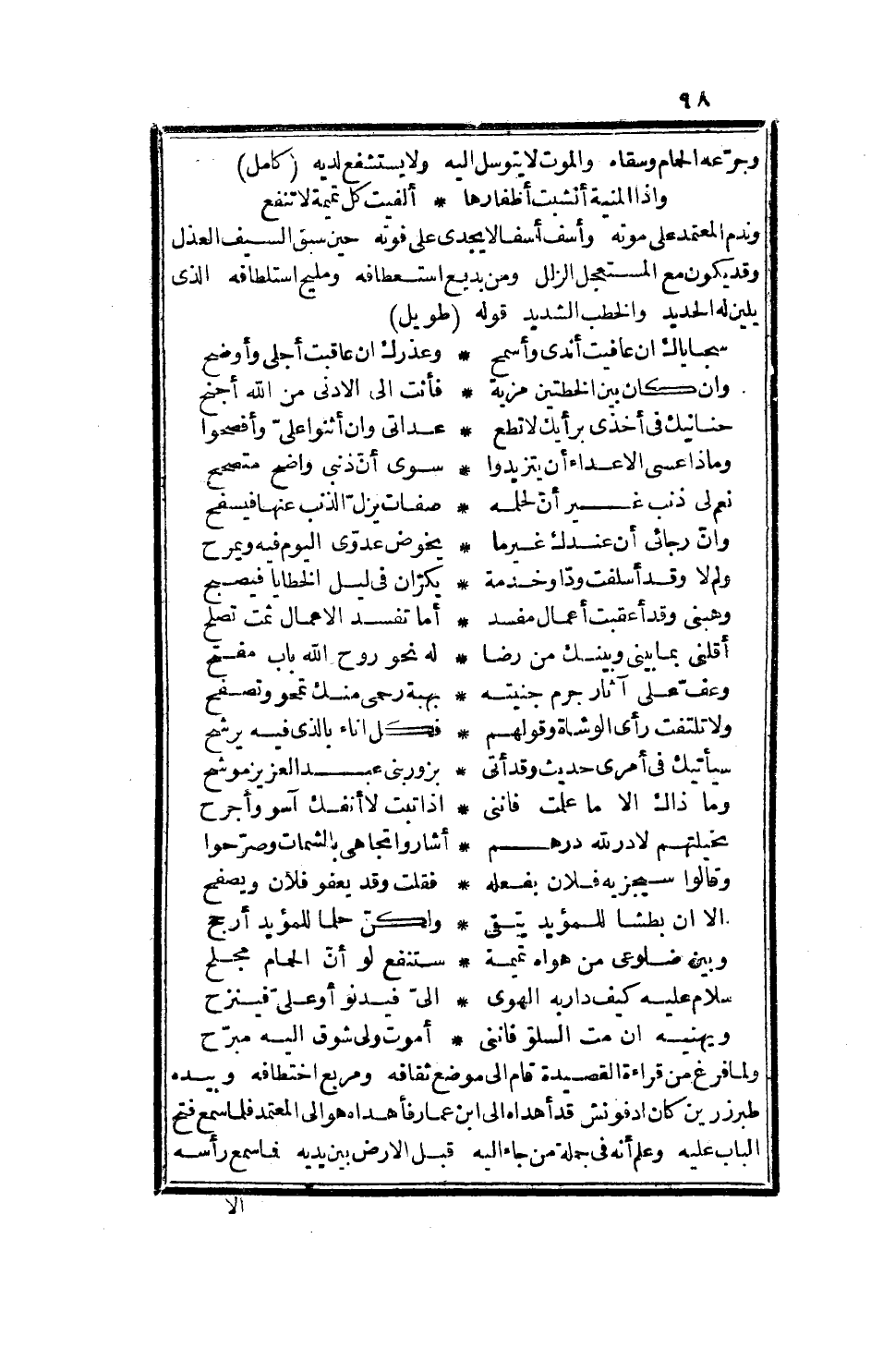 ودم المعتمد بعد موته، وأسف أسفاً لا يجدي على فوته، حين سبق السيف العذل، وقد يكون مع المستعجل الزلل، ومن بديع استعطافه، ومليح استلطافه، الذي يلين له الحديد، والخطب الشديد، قوله. طويل