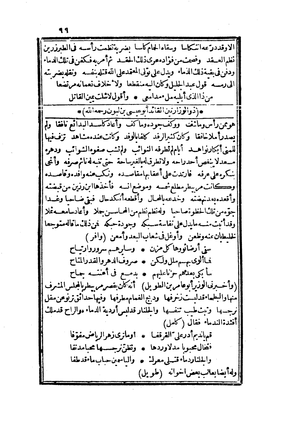 وأخبرني الوزير أبو عامر ابن الطويل أنه كان بقصر مربيطر بالمجلس المشرف منها والبطحاء قد لبست زخرفها، ودبح الغمام ومطرفها، وفيها حدائق ترنو عن مقل نرجسها، وتبث طيب تنفسها، والجلنار لبس أردية الدماء، وارع أفئدة الندماء، فقال: كامل