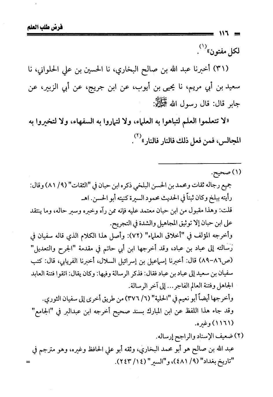 31 - أخبرنا عبد الله بن صالح البخاري، نا الحسين بن علي الحلواني، نا سعيد بن أبي مريم، نا يحيى بن أيوب، عن ابن جريج، عن أبي الزبير، عن جابر قال: قال رسول الله صلى الله عليه وسلم: «لا تتعلموا العلم لتباهوا به العلماء، ولا لتماروا به السفهاء، ولا لتخيروا به المجالس، فمن فعل ذلك فالنار فالنار».