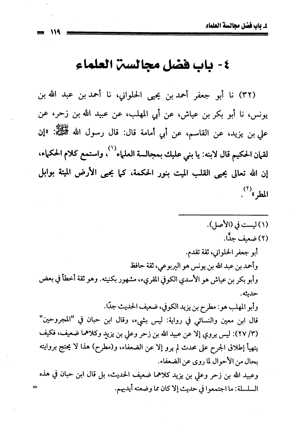 32 - نا أبو جعفر أحمد بن يحيى الحلواني، نا أحمد بن عبد الله بن يونس، نا أبو بكر بن عياش، عن أبي المهلب، عن عبيد الله بن زحر، عن علي بن يزيد، عن القاسم، عن أبي أمامة قال: قال رسول الله صلى الله عليه وسلم: «إن لقمان الحكيم قال لابنه: يا بني عليك بمجالسة العلماء، واستمع كلام الحكماء، إن الله تعالى يحيي القلب الميت بنور الحكمة، كما يحيي الأرض الميتة بوابل المطر».