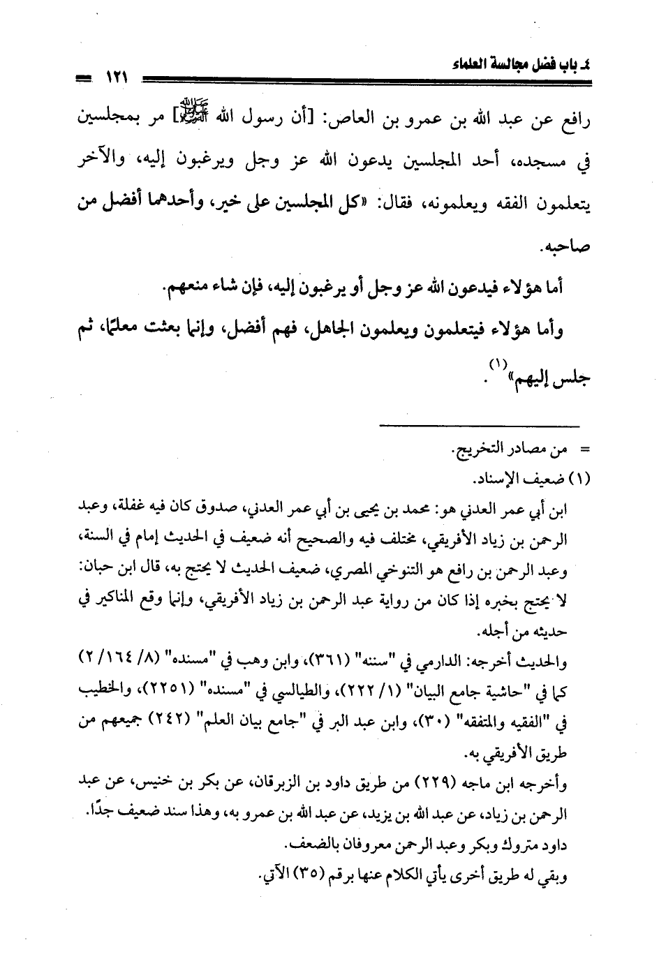 رافع عن عبد الله بن عمرو بن العاص: [أن رسول الله صلى الله عليه وسلم] مر بمجلسين في مسجده، أحد المجلسين يدعون الله عز وجل ويرغبون إليه، والآخر يتعلمون الفقه ويعلمونه، فقال: «كل المجلسين على خير، وأحدهما أفضل من صاحبه.