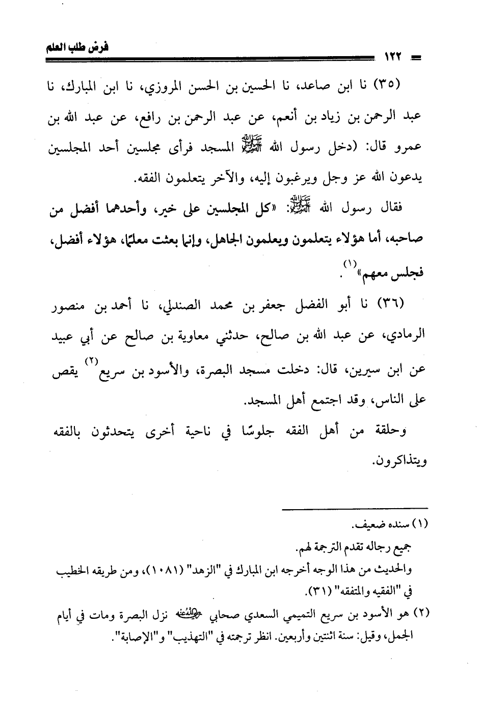 35 - نا ابن صاعد، نا الحسين بن الحسن المروزي، نا ابن المبارك، نا عبد الرحمن بن زياد بن أنعم، عن عبد الرحمن بن رافع، عن عبد الله بن عمرو قال: (دخل رسول الله صلى الله عليه وسلم المسجد فرأى مجلسين أحد المجلسين يدعون الله عز وجل ويرغبون إليه، والآخر يتعلمون الفقه.