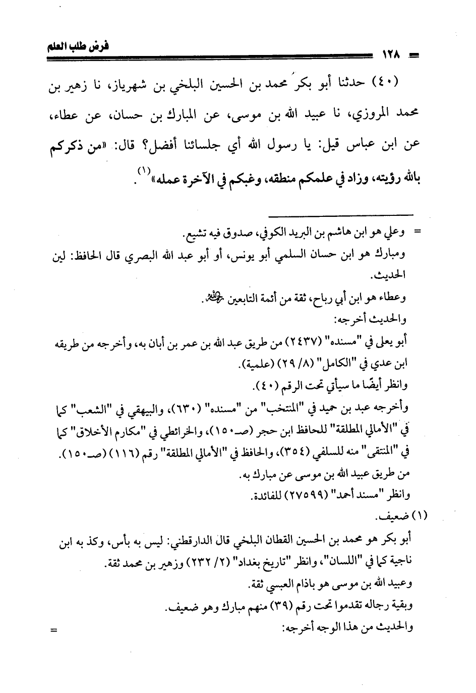 40 - حدثنا أبو بكر محمد بن الحسين البلخي بن شهرياز، نا زهير بن محمد المروزي، نا عبيد الله بن موسى، عن المبارك بن حسان، عن عطاء، عن ابن عباس قيل: يا رسول الله أي جلسائنا أفضل؟ قال: «من ذكركم بالله رؤيته، وزاد في علمكم منطقه، ورغبكم في الآخرة عمله».