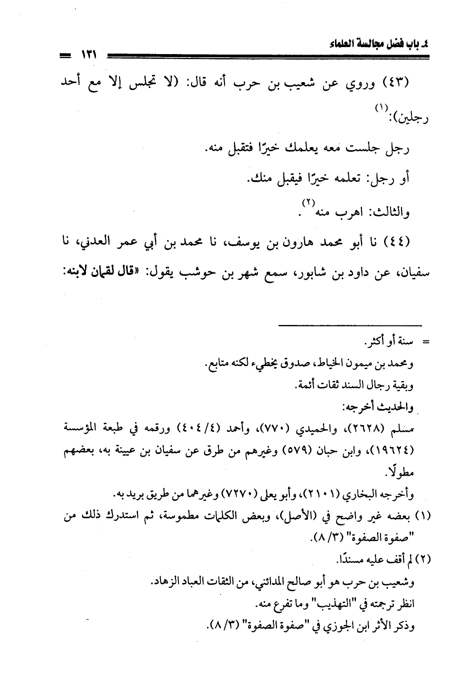 43 - وروي عن شعيب بن حرب أنه قال: (لا تجلس إلا مع أحد رجلين):