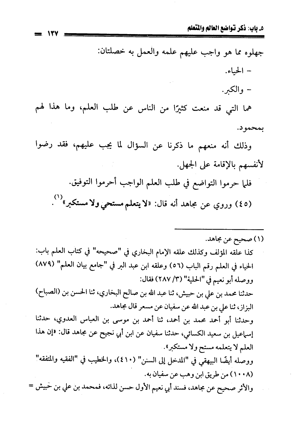45 - وروي عن مجاهد أنه قال: «لا يتعلم مستحي ولا مستكبر».