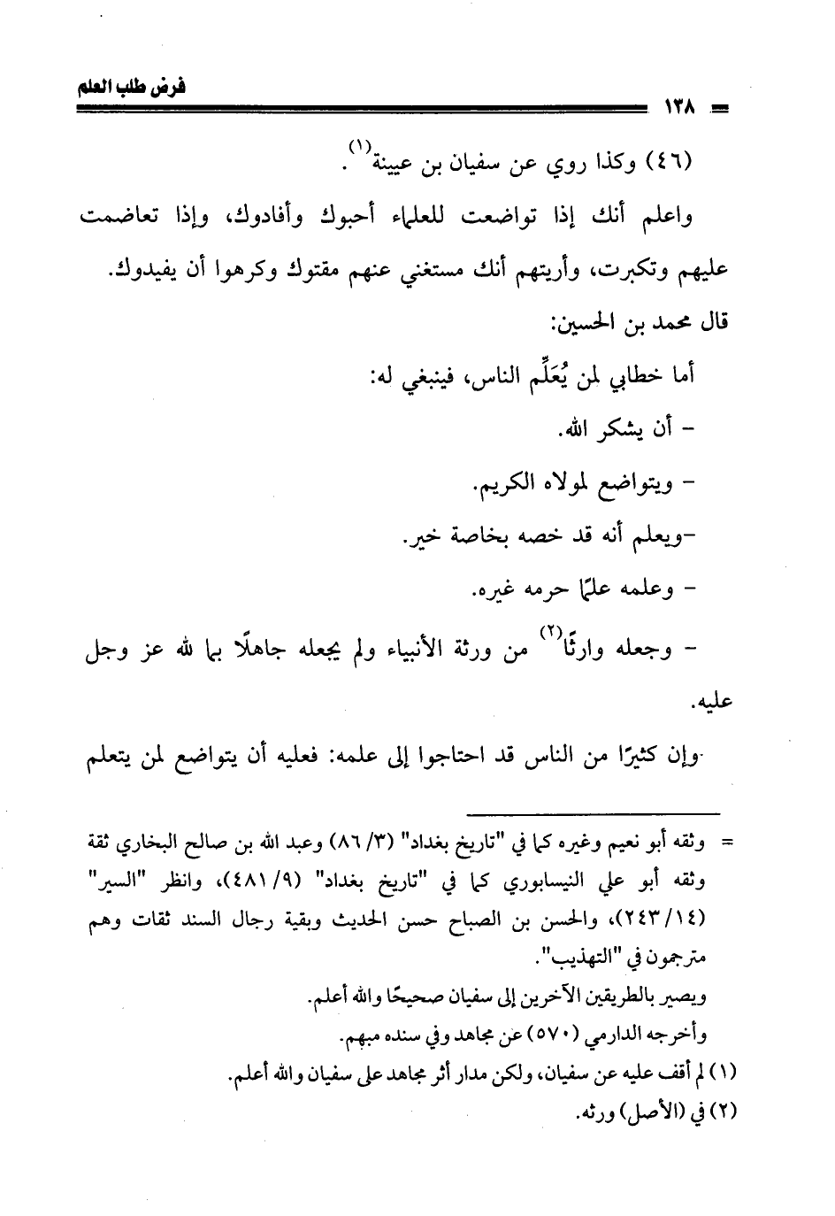 واعلم أنك إذا تواضعت للعلماء أحبوك وأفادوك، وإذا تعاضمت عليهم وتكبرت، وأريتهم أنك مستغني عنهم مقتوك وكرهوا أن يفيدوك.