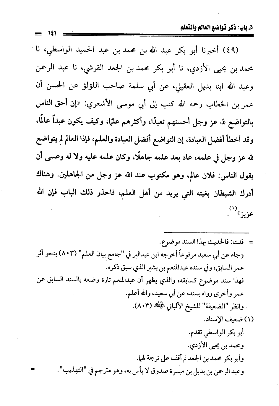 49 - أخبرنا أبو بكر عبد الله بن محمد بن عبد الحميد الواسطي، نا محمد بن يحيى الأزدي، نا أبو بكر محمد بن الجعد القرشي، نا عبد الرحمن وعبد الله ابنا بديل العقيلي، عن أبي سلمة صاحب اللؤلؤ عن الحسن أن عمر بن الخطاب رحمه الله كتب إلى أبي موسى الأشعري: «إن أحق الناس بالتواضع لله عز وجل أحسنهم تعبدا، وأكثرهم علما، وكيف يكون عبدا عالما، وقد أخطأ أفضل العبادة، إن التواضع أفضل العبادة والعلم، فإذا العالم لم يتواضع لله عز وجل في علمه، عاد بعد علمه جاهلا، وكان علمه عليه ولا له وعسى أن يقول الناس: فلان عالم، وهو مكتوب عند الله عز وجل من الجاهلين، وهناك أدرك الشيطان بغيته التي يريد من أهل العلم، فاحذر ذلك الباب فإن الله عزيز».