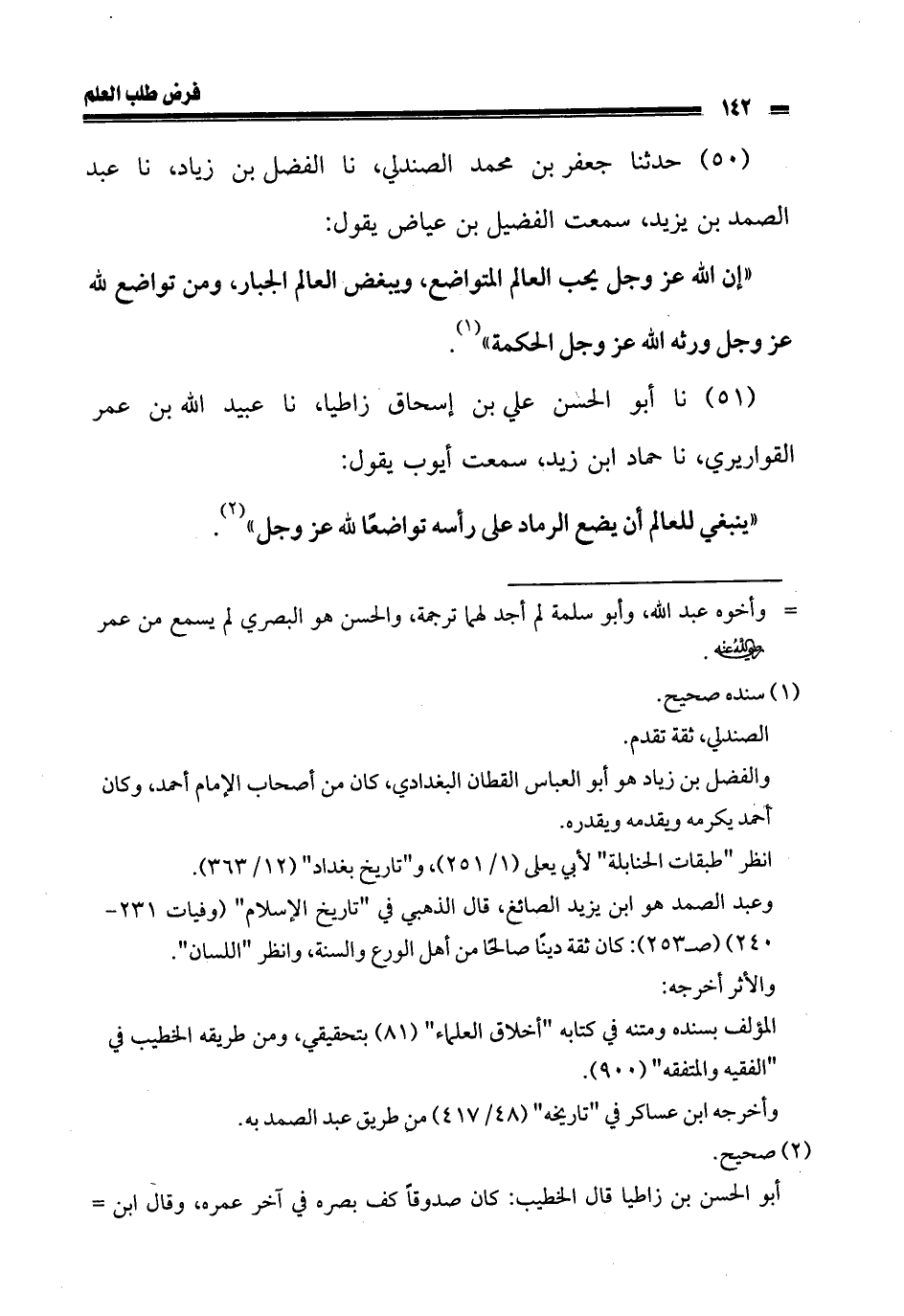50 - حدثنا جعفر بن محمد الصندلي، نا الفضل بن زياد، نا عبد الصمد بن يزيد، سمعت الفضل بن عياض يقول: