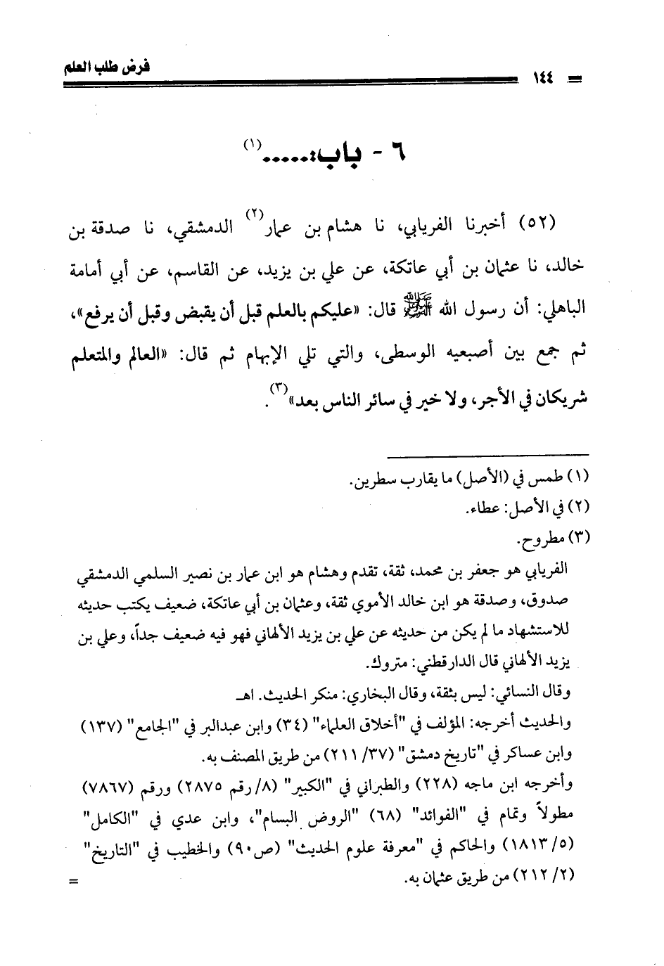 52 - أخبرنا الفريابي، نا هشام بن عمار الدمشقي، نا صدقة بن خالد، نا عثمان بن أبي عاتكة، عن علي بن يزيد، عن القاسم، عن أبي أمامة الباهلي: أن رسول الله صلى الله عليه وسلم قال: «عليكم بالعلم قبل أن يقبض وقبل أن يرفع»، ثم جمع بين أصبعيه الوسطى، والتي تلي الإبهام ثم قال: «العالم والمتعلم شريكان في الأجر، ولا خير في سائر الناس بعد».
