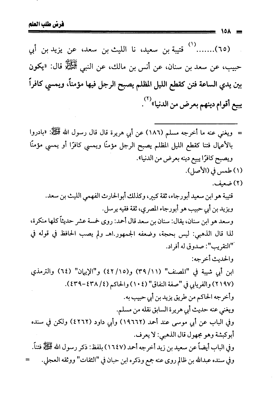 65 - .. .. .. قتيبة بن سعيد، نا الليث بن سعد، عن يزيد بن أبي حبيب، عن سعد بن سنان، عن أنس بن مالك، عن النبي صلى الله عليه وسلم قال: «يكون بين يدي الساعة فتن كقطع الليل المظلم يصبح الرجل فيها مؤمنا، ويمسي كافرا يبيع أقوام دينهم بعرض من الدنيا».