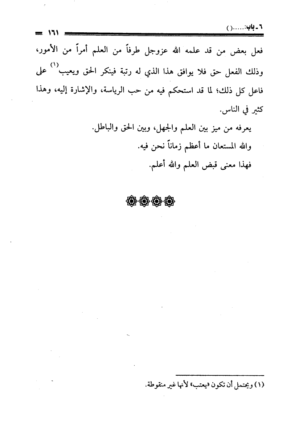 فعل بعض من قد علمه الله عز وجل طرفا من العلم أمرا من الأمور، وذلك الفعل حق فلا يوافق هذا الذي له رتبة فينكر الحق ويعيب على فاعل كل ذلك؛ لما قد استحكم فيه من حب الرياسة، والإشارة إليه، وهذا كثير في الناس.