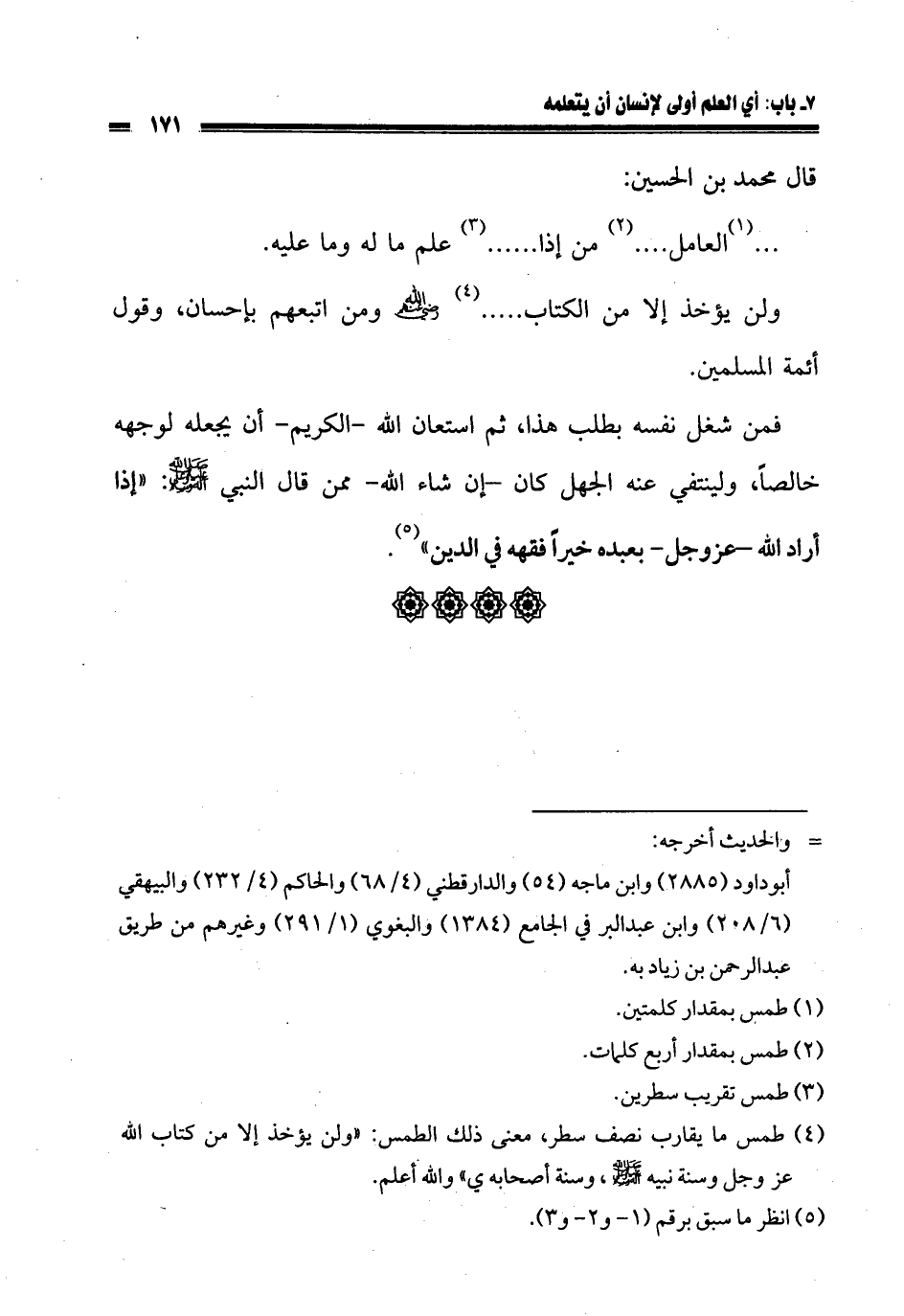 فمن شغل نفسه بطلب هذا، ثم استعان الله -الكريم- أن يجعله لوجهه خالصا، ولينتفي عنه الجهل كان -إن شاء الله- ممن قال النبي صلى الله عليه وسلم: «إذا أراد الله -عز وجل- بعبده خيرا فقهه في الدين».