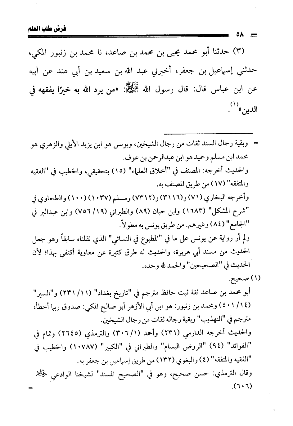3 - حدثنا أبو محمد يحيى بن محمد بن صاعد، نا محمد بن زنبور المكي، حدثني إسماعيل بن جعفر، أخبرني عبد الله بن سعيد بن أبي هند عن أبيه عن ابن عباس قال: قال رسول الله صلى الله عليه وسلم: «من يرد الله به خيرا يفقهه في الدين».