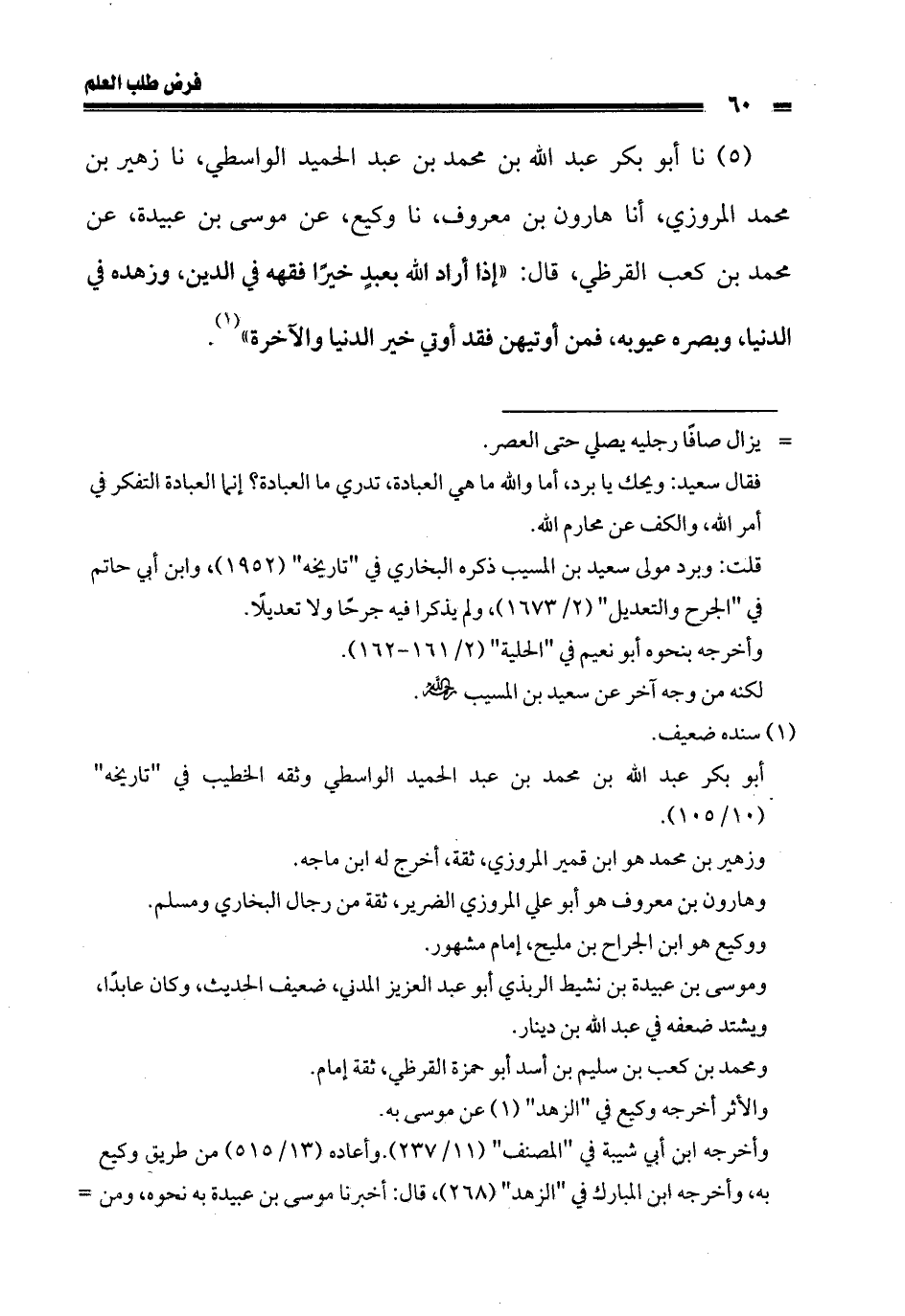 5 - نا أبو بكر عبد الله بن محمد بن عبد الحميد الواسطي، نا زهير بن محمد المروزي، أنا هارون بن معروف، نا وكيع، عن موسى بن عبيدة، عن محمد بن كعب القرظي، قال: «إذا أراد الله بعبد خيرا فقهه في الدين، وزهده في الدنيا، وبصره عيوبه، فمن أوتيهن فقد أوتي خير الدنيا والآخرة».