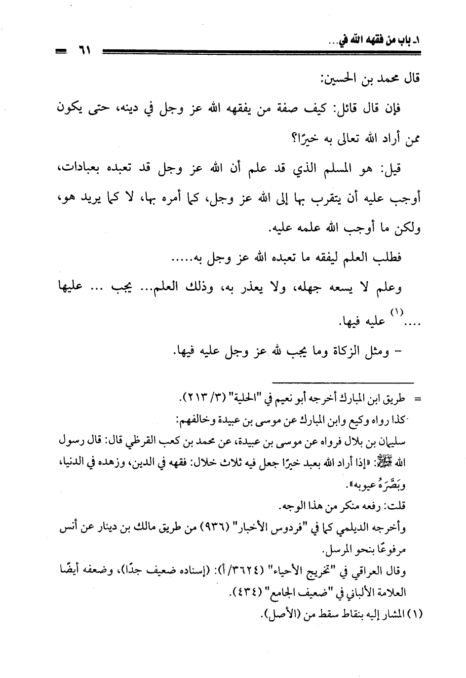 فإن قال قائل: كيف صفة من يفقهه الله عز وجل في دينه، حتى يكون ممن أراد الله تعالى به خيرا؟