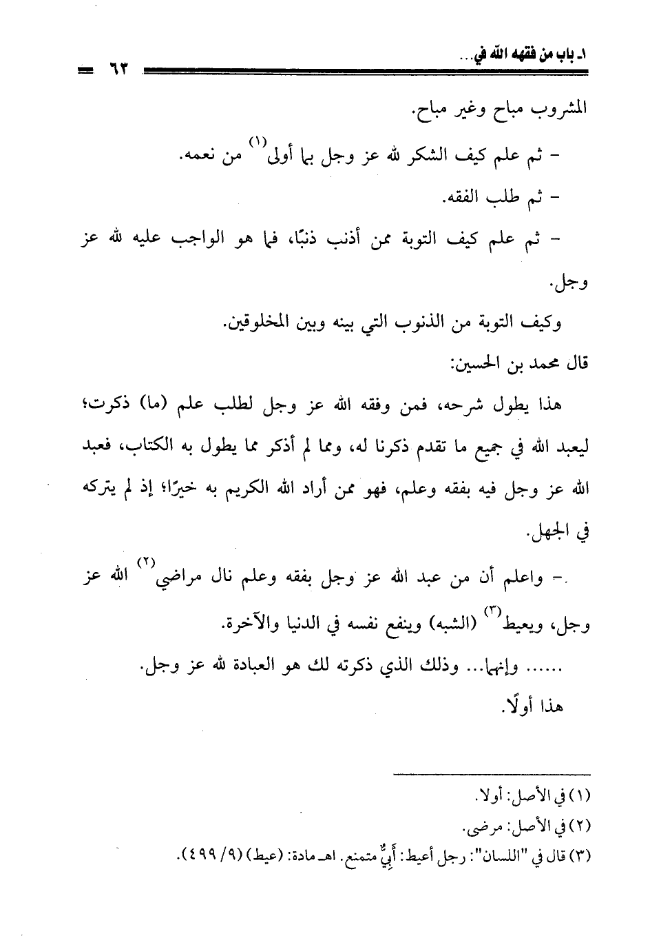 -واعلم أن من عبد الله عز وجل بفقه وعلم نال مراضي الله عز وجل، ويعيط (الشبه) وينفع نفسه في الدنيا والآخرة.