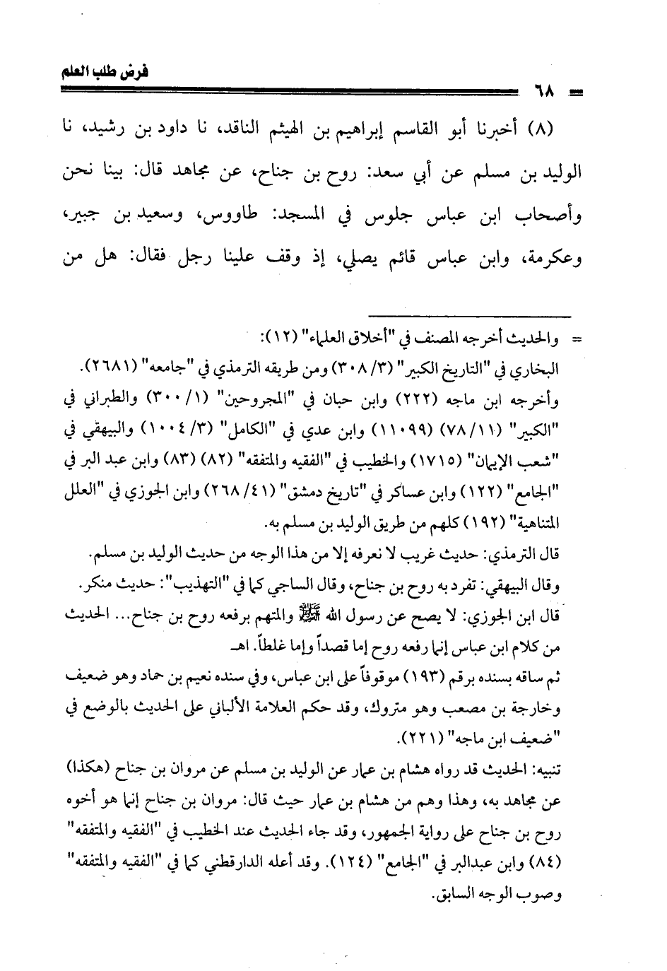 8 - أخبرنا أبو القاسم إبراهيم بن الهيثم الناقد، نا داود بن رشيد، نا الوليد بن مسلم عن أبي سعد: روح بن جناح، عن مجاهد قال: بينا نحن وأصحاب ابن عباس جلوس في المسجد: طاووس، وسعيد بن جبير، وعكرمة، وابن عباس قائم يصلي، إذ وقف علينا رجل فقال: هل من