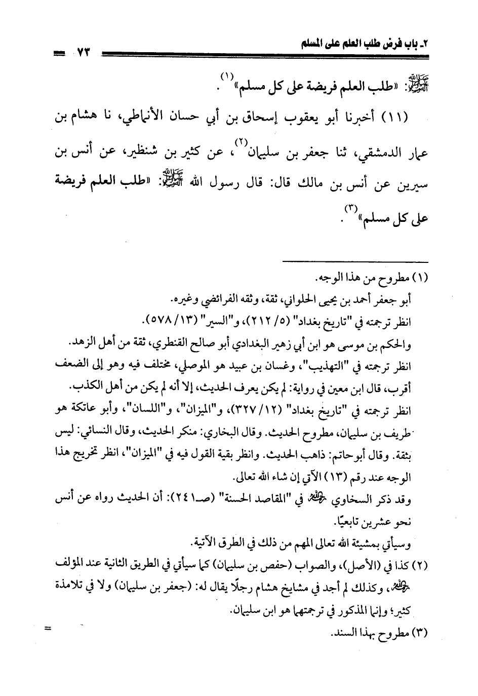 11 - أخبرنا أبو يعقوب إسحاق بن أبي حسان الأنماطي، نا هشام بن عمار الدمشقي، ثنا جعفر بن سليمان، عن كثير بن شنظير، عن أنس بن سيرين عن أنس بن مالك قال: قال رسول الله صلى الله عليه وسلم: «طلب العلم فريضة على كل مسلم».