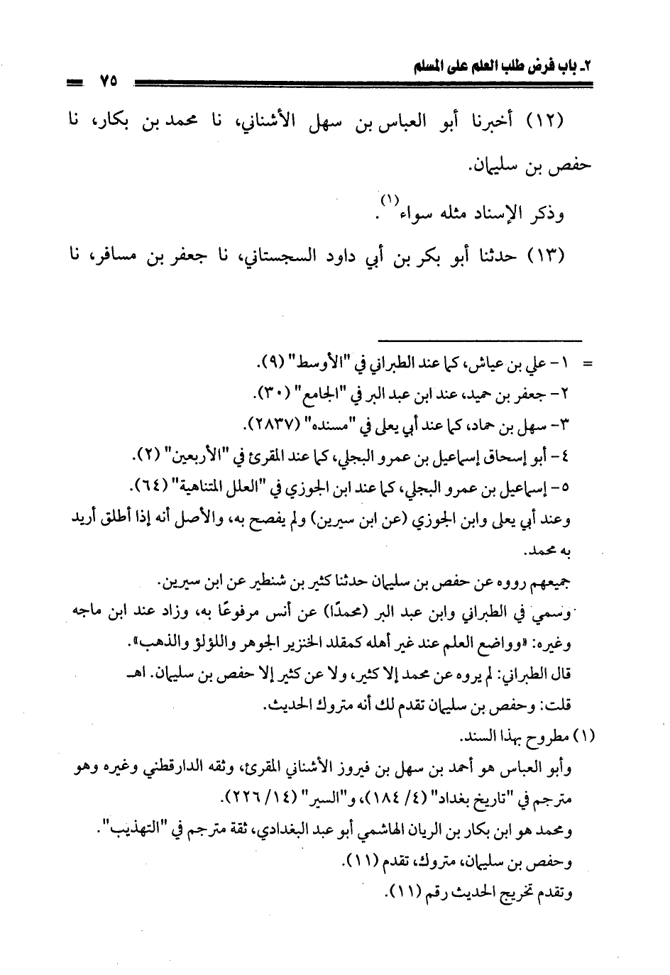 12 - أخبرنا أبو العباس بن سهل الأشناني، نا محمد بن بكار، نا حفص بن سليمان.