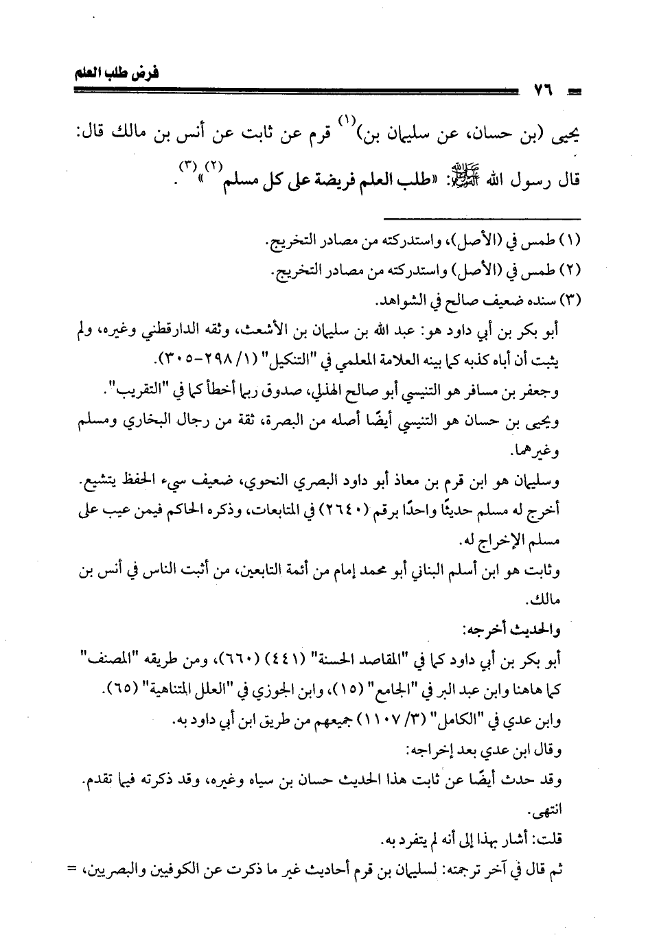 يحيى (بن حسان، عن سليمان بن) قرم عن ثابت عن أنس بن مالك قال: قال رسول الله صلى الله عليه وسلم: «طلب العلم فريضة على كل مسلم».