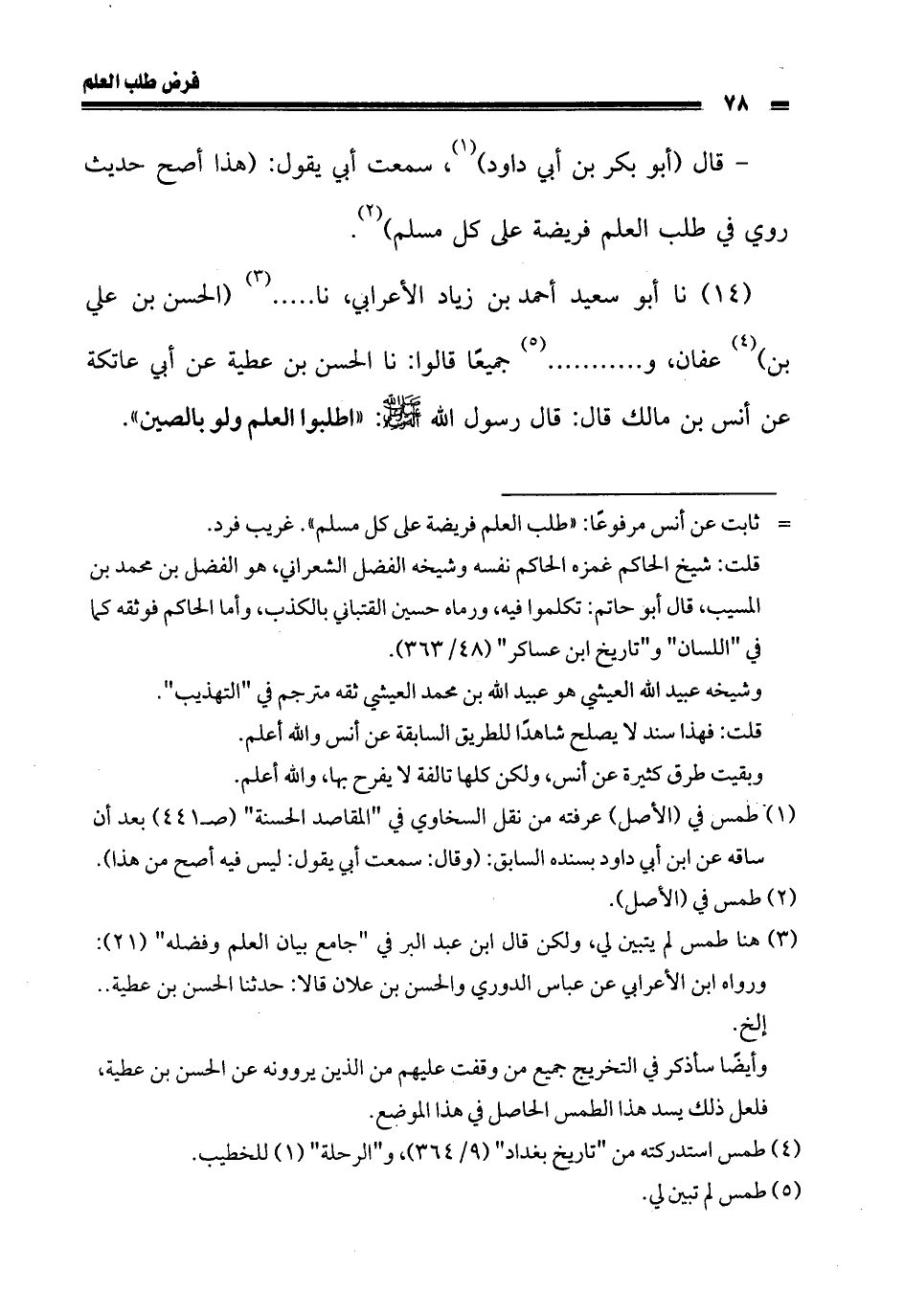 -قال (أبو بكر بن أبي داود)، سمعت أبي يقول: (هذا أصح حديث روي في طلب العلم فريضة على كل مسلم).