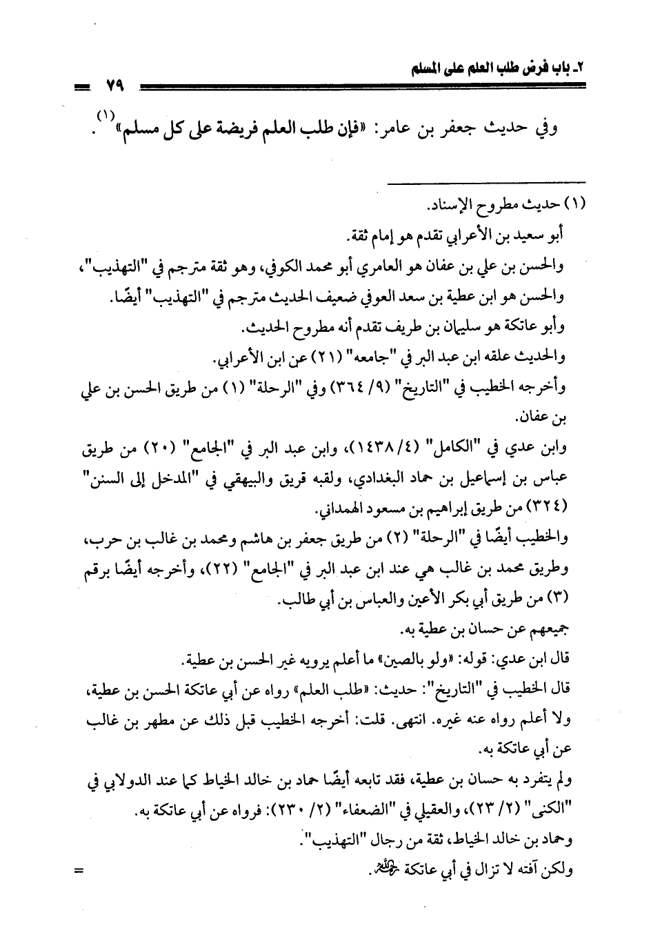 وفي حديث جعفر بن عامر: «فإن طلب العلم فريضة على كل مسلم».