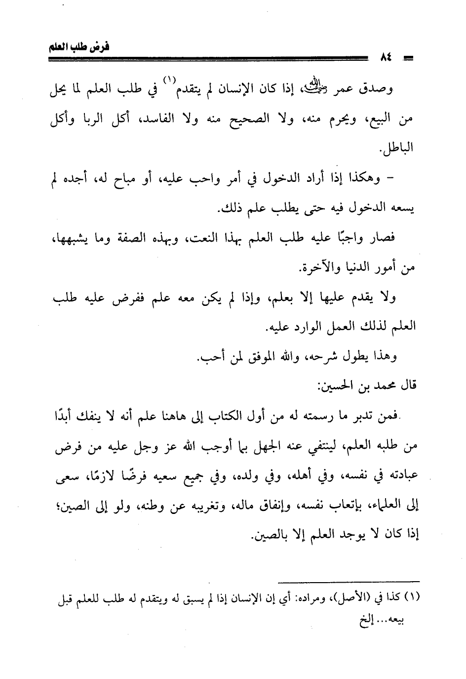 فصار واجبا عليه طلب العلم بهذا النعت، وبهذه الصفة وما يشبهها، من أمور الدنيا والآخرة.
