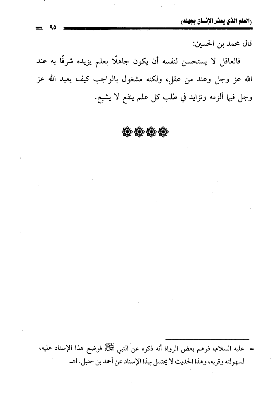 فالعاقل لا يستحسن لنفسه أن يكون جاهلا بعلم يزيده شرفا به عند الله عز وجل وعند من عقل، ولكنه مشغول بالواجب كيف يعبد الله عز وجل فيما ألزمه وتزايد في طلب كل علم ينفع لا يشبع.