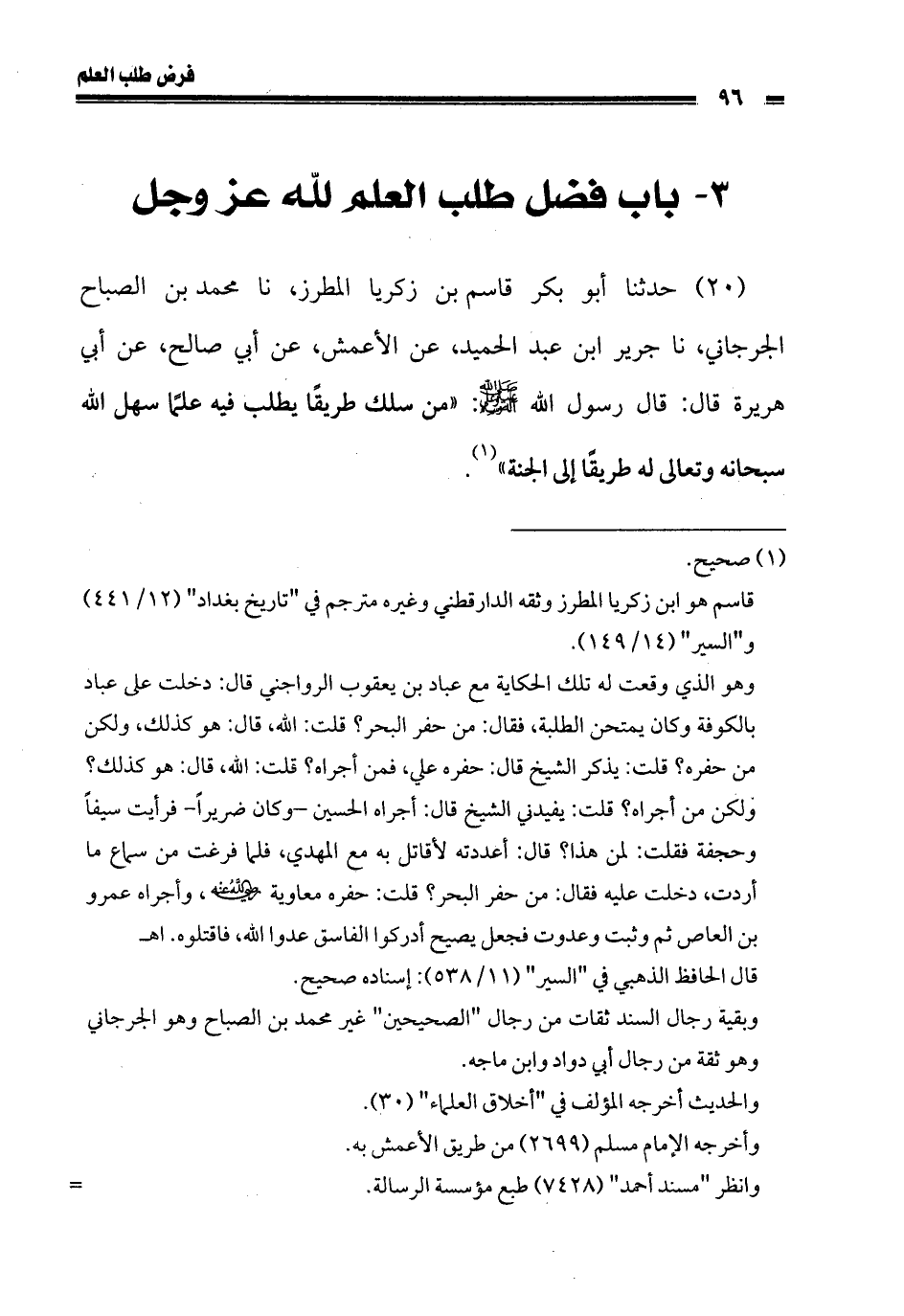 20 - حدثنا أبو بكر قاسم بن زكريا المطرز، نا محمد بن الصباح الجرجاني، نا جرير بن عبد الحميد، عن الأعمش، عن أبي صالح، عن أبي هريرة قال: قال رسول الله صلى الله عليه وسلم: «من سلك طريقا يطلب فيه علما سهل الله سبحانه وتعالى له طريقا إلى الجنة».