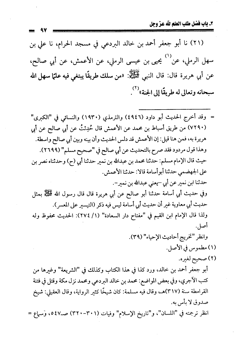 21 - نا أبو جعفر أحمد بن خالد البردعي في مسجد الحرام، نا علي بن سهل الرملي، عن يحيى بن عيسى الرملي، عن الأعمش، عن أبي صالح، عن أبي هريرة قال: قال النبي صلى الله عليه وسلم: «من سلك طريقا يبتغي فيه علما سهل الله سبحانه وتعالى له طريقا إلى الجنة».