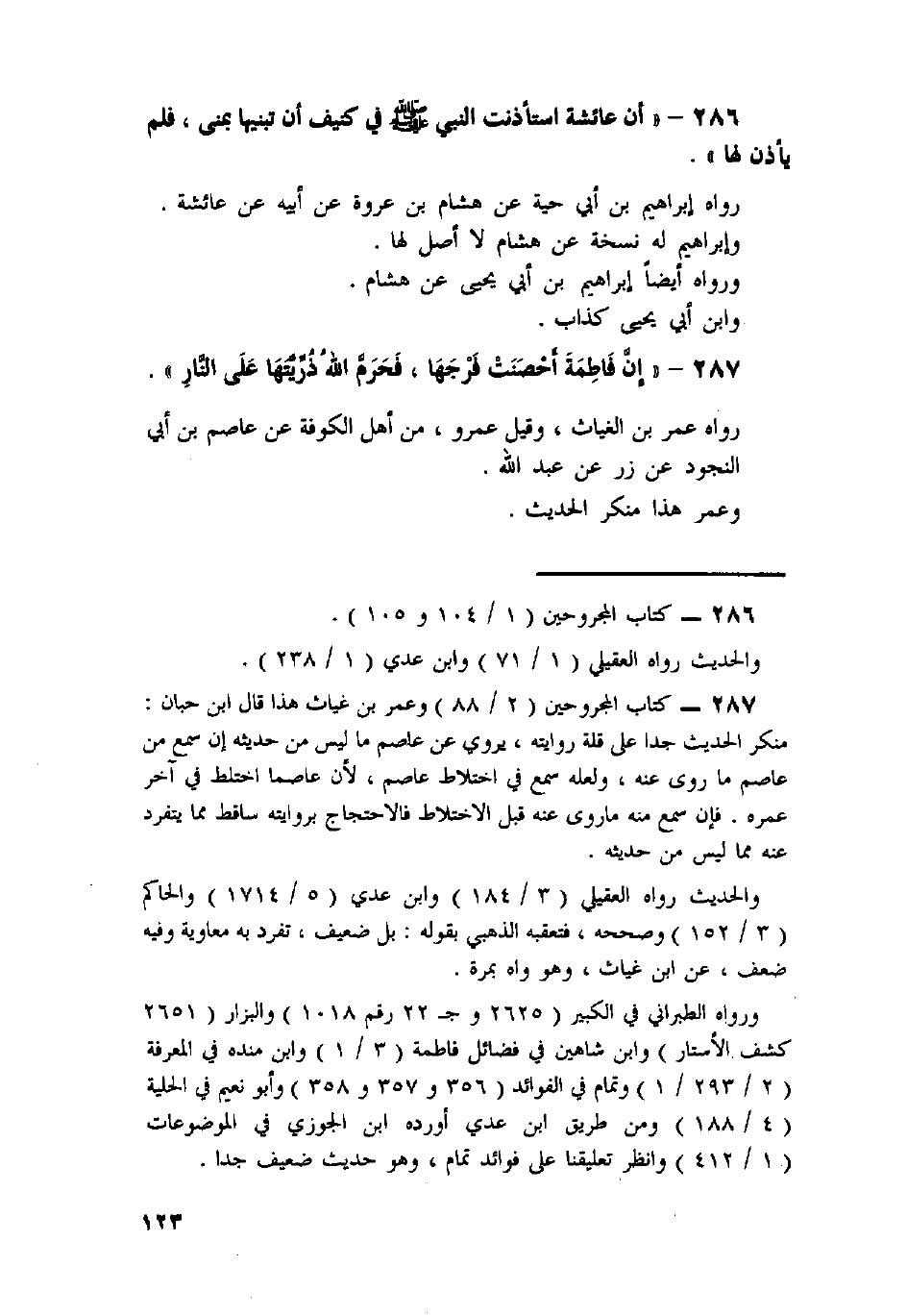 287 - «إِنَّ فَاطِمَةَ أَحْصَنَتْ فَرْجَهَا، فَحَرَّمَ اللَّهُ ذُرِّيَّتَهَا عَلَى النَّارِ» .