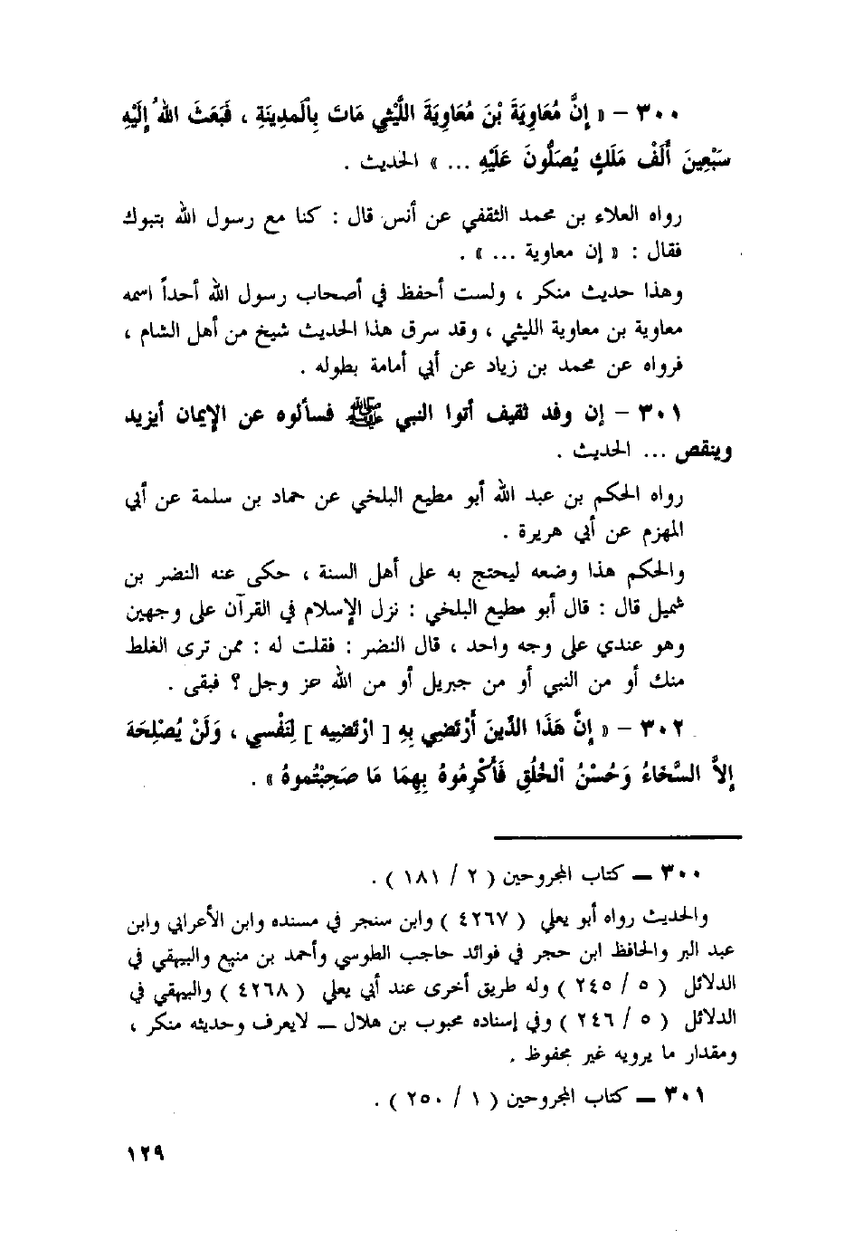 300 - «إِنَّ مُعَاوِيَةَ بْنَ مُعَاوِيَةَ اللَّيْثِيَّ مَاتَ بِالْمَدِينَةِ، فَبَعَثَ اللَّهُ إِلَيْهِ سَبْعِينَ أَلْفَ مَلَكٍ يُصَلُّونَ عَلَيْهِ. . .» الْحَدِيثَ.