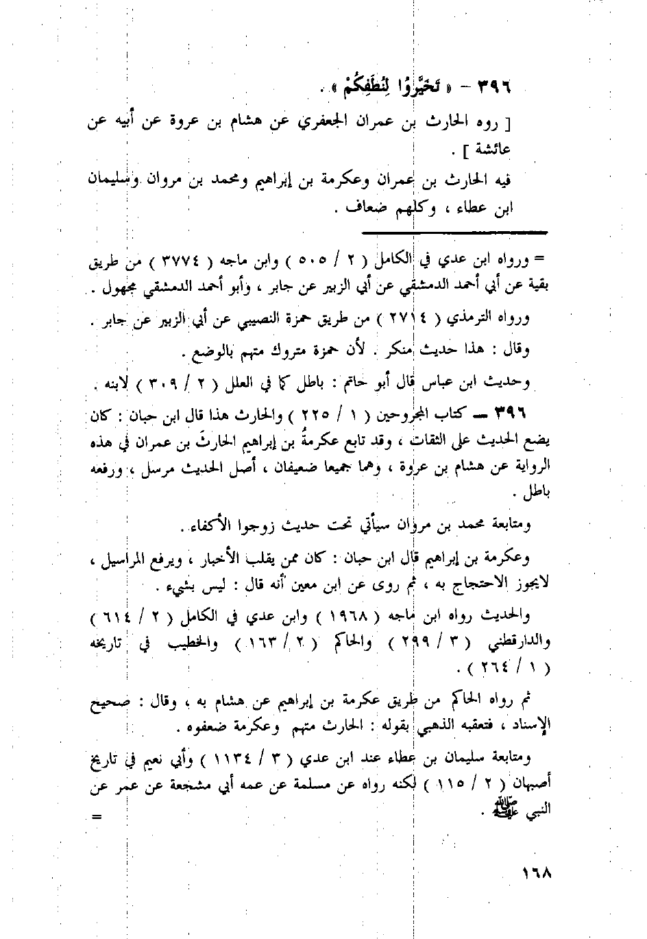 رَوَاهُ الْحَارِثُ بْنُ عِمْرَانَ الْجَعْفَرِيُّ، عَنْ هِشَامِ بْنِ عُرْوَةَ، عَنْ أَبِيهِ، عَنْ عَائِشَةَ.