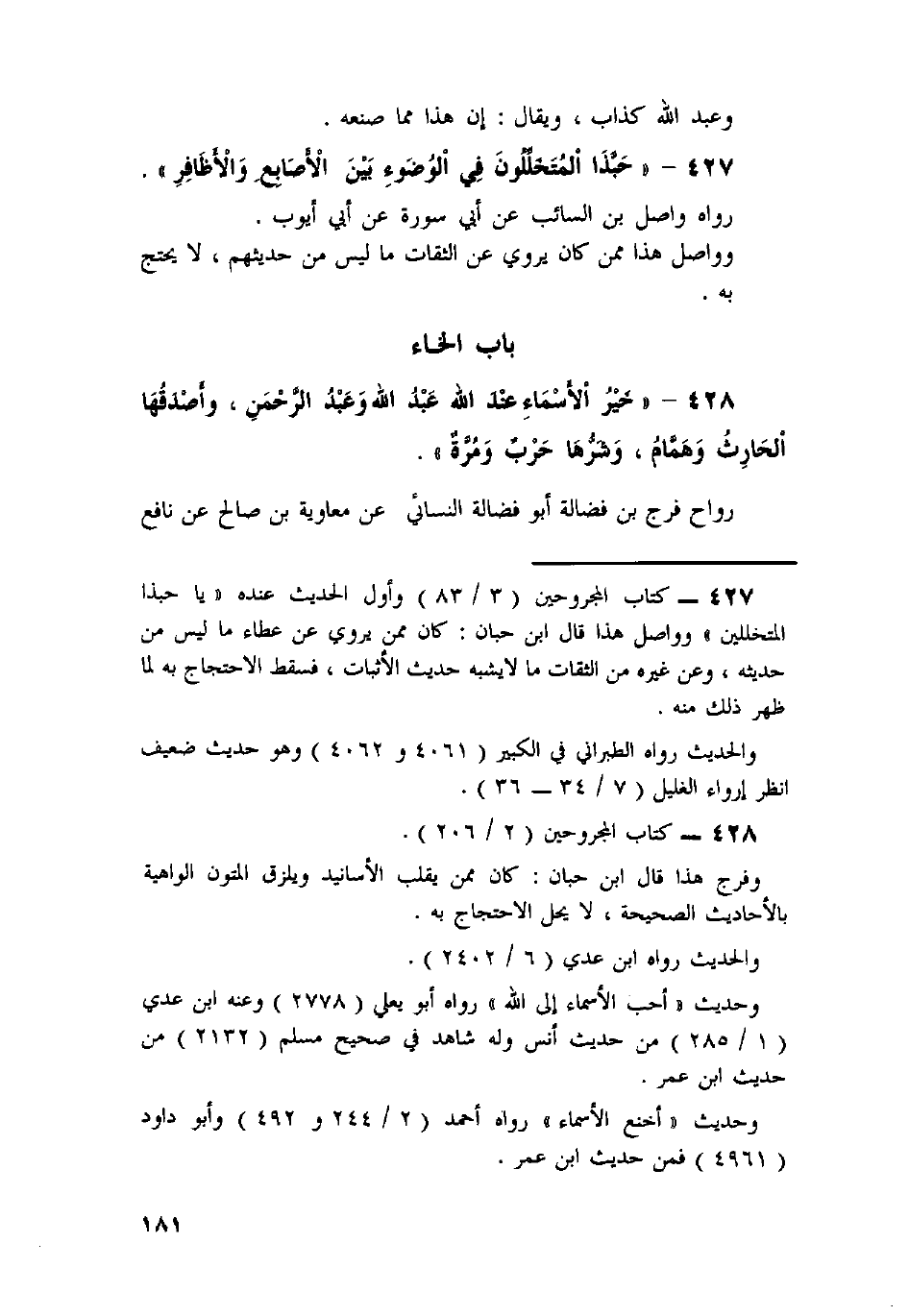 428 - «خَيْرُ الأَسْمَاءِ عِنْدَ اللَّهِ عَبْدُ اللَّهِ وَعَبْدُ الرَّحْمَنِ، وَأَصْدَقُهَا الْحَارِثُ وَهَمَّامٌ، وَشَرُّهَا حَرْبٌ وَمُرَّةُ» .