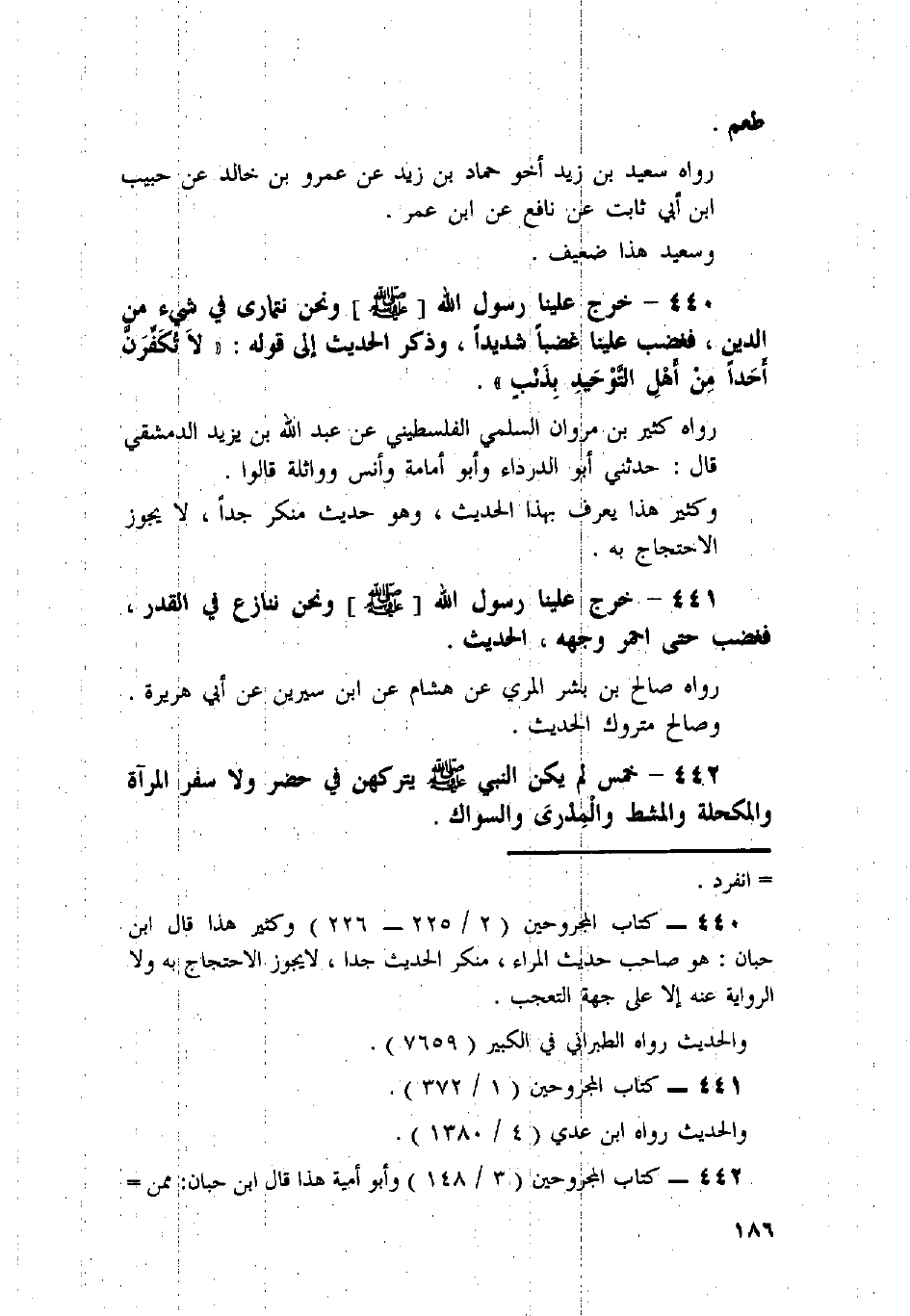 440 - خَرَجَ عَلَيْنَا رَسُولُ اللَّهِ صَلَّى اللَّهُ عَلَيْهِ وَسَلَّمَ وَنَحْنُ نَتَمَارَى فِي شَيْءٍ مِنَ الدِّينِ، فَغَضِبَ عَلَيْنَا غَضَبًا شَدِيدًا، وَذَكَرَ الْحَدِيثَ إِلَى قَوْلِهِ: «لا تُكَفِّرُنَّ أَحَدًا مِنْ أَهْلِ التَّوْحِيدِ بِذَنْبٍ» .