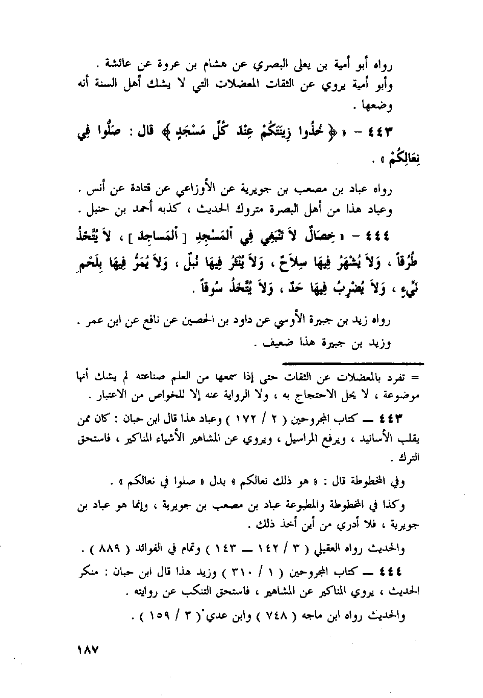 444 - «خِصَالٌ لا تَنْبَغِي فِي الْمَسَاجِدِ، لا يُتَّخَذُ طُرُقًا، وَلا يُشْهَرُ فِيهَا سِلاحٌ، وَلا يُنْثَرُ فِيهَا نَبْلٌ، وَلا يَمُرُّ فِيهَا بِلَحْمٍ نَيِّءٍ، وَلا يُضْرَبُ فِيهَا حَدٌّ، وَلا يُتَّخَذُ سُوقًا» .
