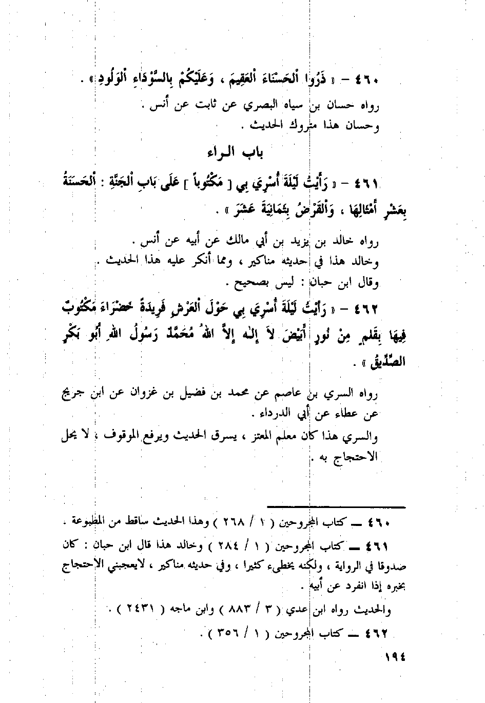 461 - " رَأَيْتُ لَيْلَةَ أُسْرِيَ بِي مَكْتُوبًا عَلَى بَابِ الْجَنَّةِ: الْحَسَنَةُ بِعَشْرِ أَمْثَالِهَا، وَالْقَرْضُ بِثَمَانِيَةَ عَشَرَ ".